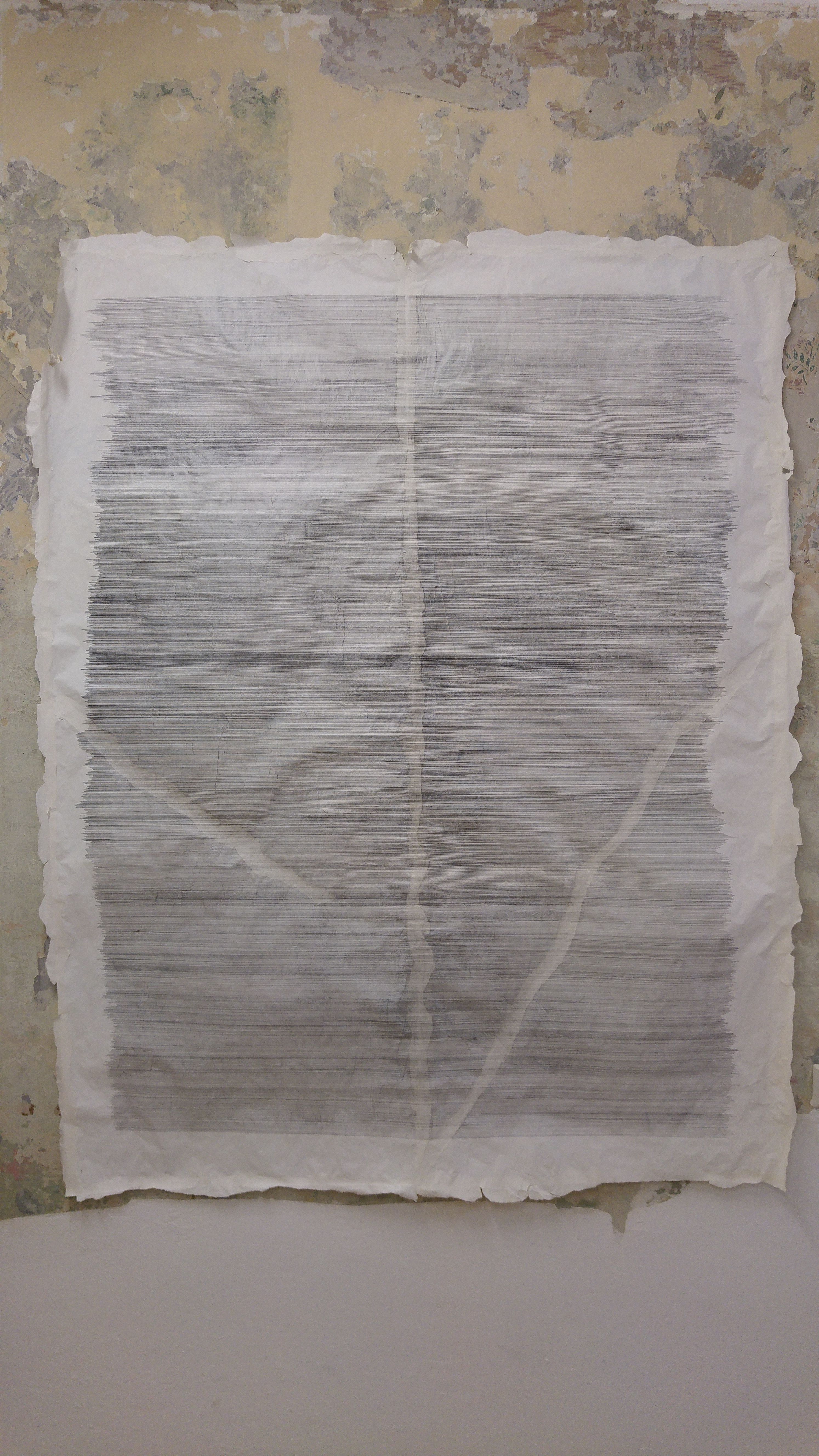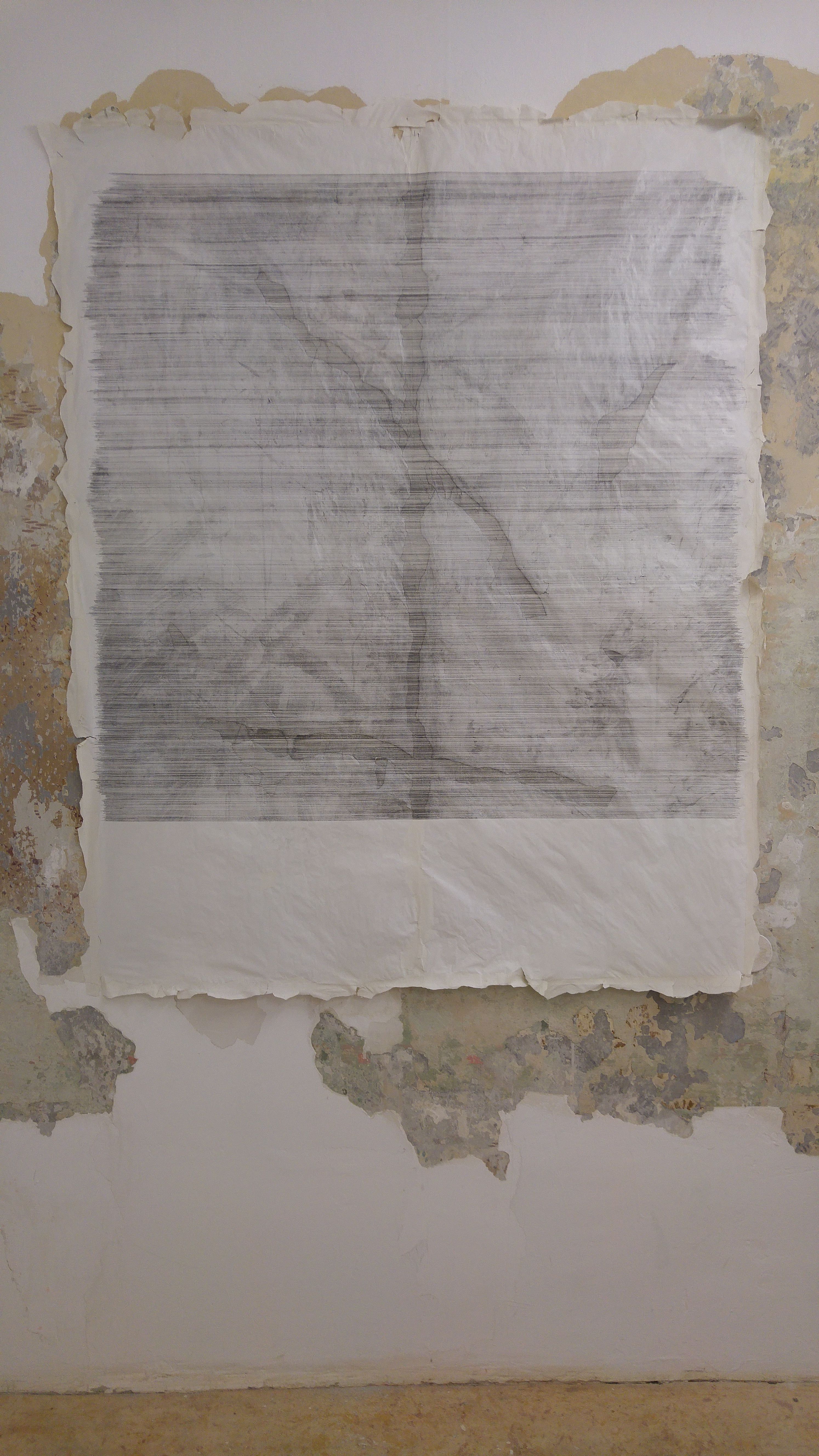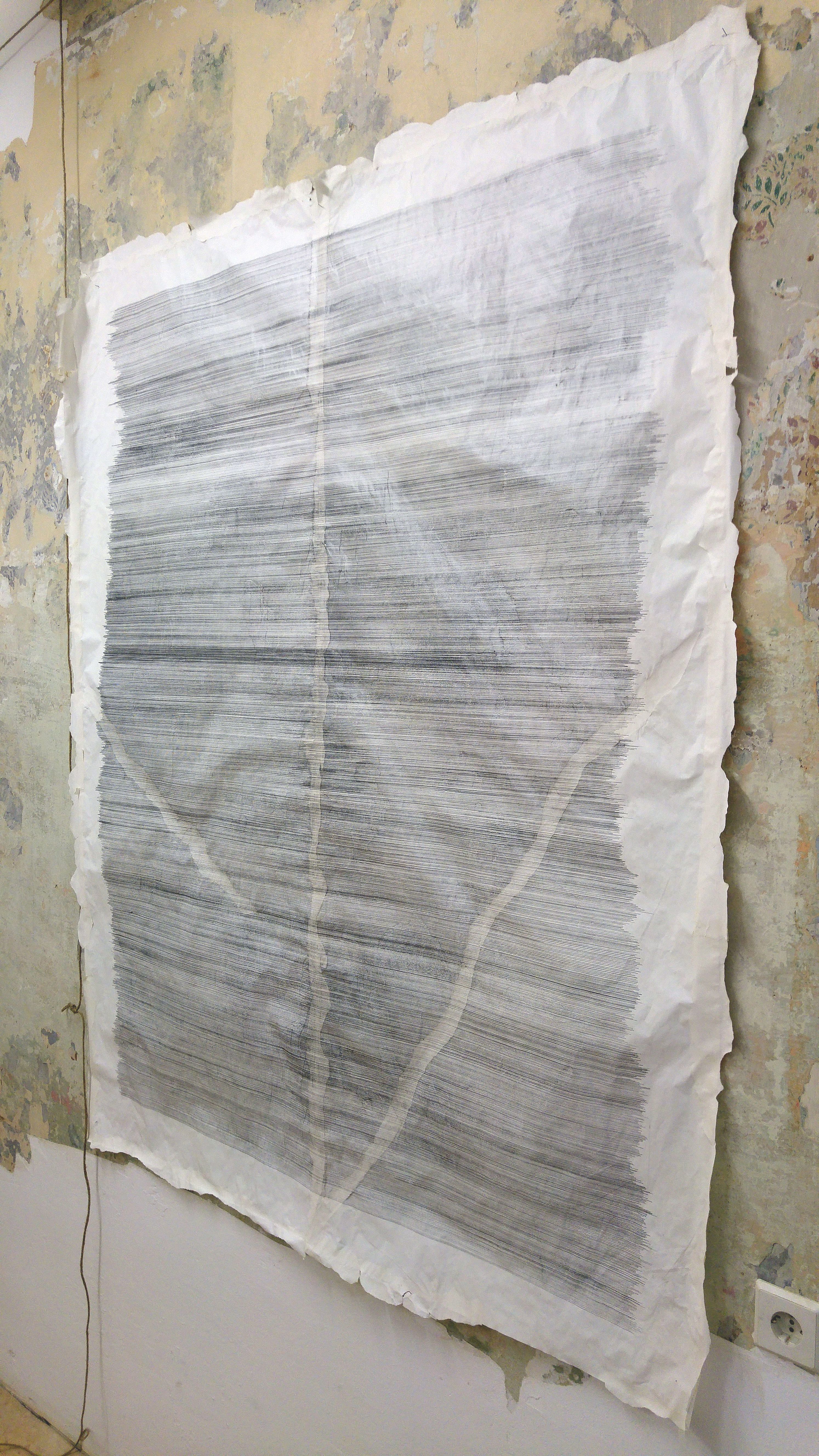 T.K., "durch die wüste", Bleistift auf Briefmarkenpapier, 186 x 148 cm.