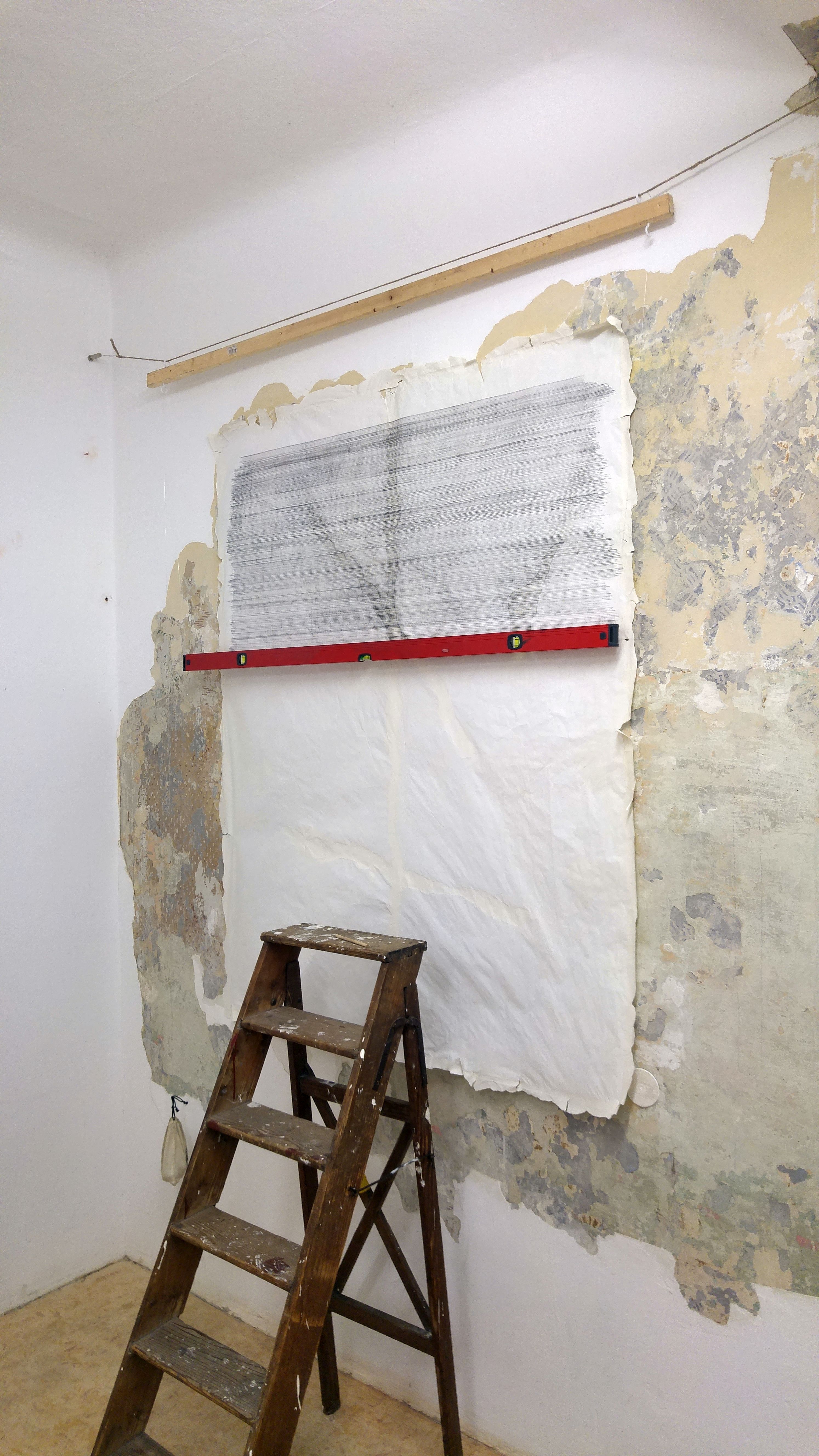 ... Mit jedem gezogenen Bleistiftstrich zählt er (zwar nicht die Zeilen), doch jedes einzelne Wort und Satzzeichen, das im Gedichtband abgedruckt ist. Somit ist alles, was dort der Fall ist – jedes Wort, jeder Punkt, Beistrich, Gedankenstrich des Buchs – auf der großen grauen Landkarte verzeichnet, und hat jeweils eine horizontale Spur / einen materiellen Abrieb auf dem Papier hinterlassen. Auch letzteres Trägermaterial hat eine Geschichte beziehungsweise einige Umschichtungen erfahren. Es wurde aus mehreren, zuvor durch Wässerung vom Leim befreiten Bögen von Briefmarkenpapier zum vorliegenden Format zusammengeklittert. Die Verläufe der Klebspuren und der überarbeiteten Risse, die Aufdoppelungen und Wellungen des Papiers haben sich als Zufallsgegebenheiten in die exakte Strich-Zählung ebenso eingetragen, wie die darunterliegende Wand, die selbst schon einem Palimpsest gleicht und deren amorphe Strukturen das horizontale Linienfeld durchwachsen.