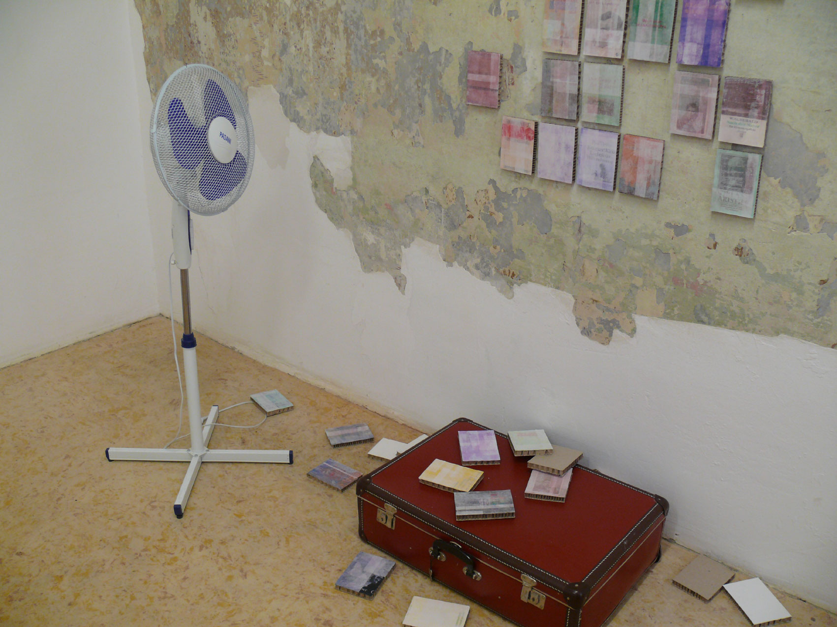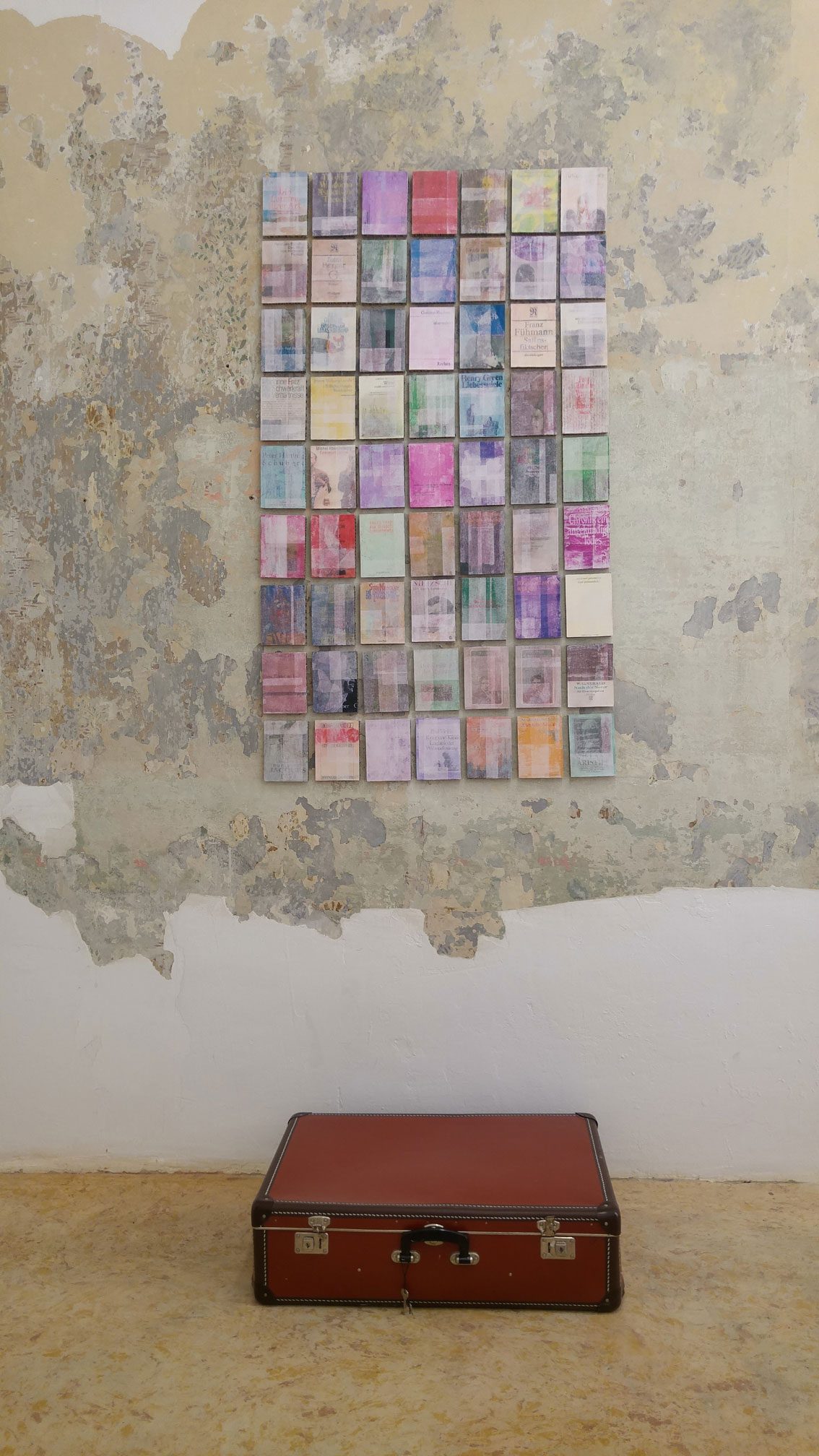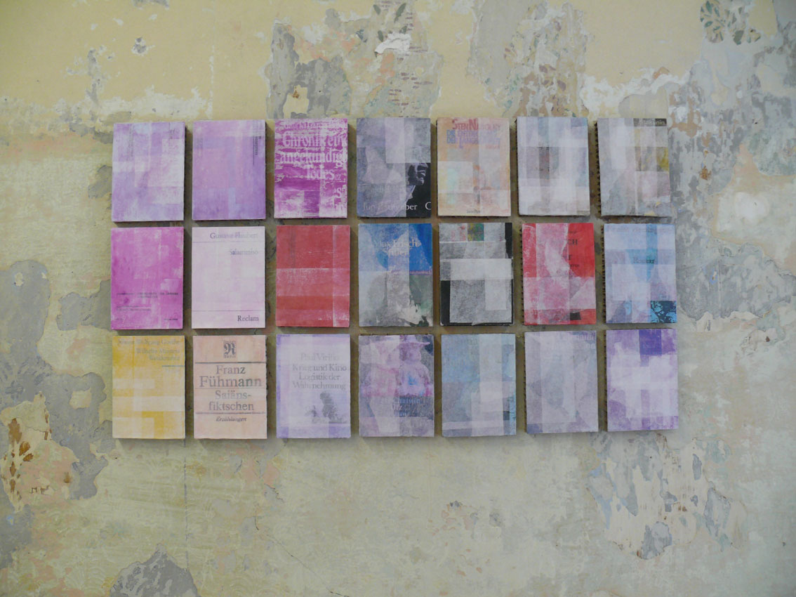 Jedes Leben endet ausnahmslos als Fragment, möchte man rufen. Ist das die Antwort auf Leitners anekdotische Selbstarchivierung? – Jede klassische Zeitkapsel ist ein Ordnungsversuch, der Gegenstände für unbekannten Adressaten zur Schau stellt, ein vergrabener Katalog des Wissens. Kleinlerchers »Coverpaintings« aber formuliert statt einem Katalog der Kofferbücher nur verschiedene Erinnerungsgrade an Lektüren und Besitztümer, die Arbeit eröffnet einen intensiven Assoziations- und Empfindungsraum, und die Empfindung läuft meiner Ansicht nach auf die »Intensitätsbeziehung« von Sachtrieb und Formtrieb hinaus, wie sie Friedrich Schiller in Über die ästhetische Erziehung des Menschen während der Französischen Revolution 1793 untersucht hat. – Das Höchste, was die Erinnerung leisten kann, besteht nach Schiller in einem Schwanken zwischen diesen beiden Prinzipien, Form und Sache, wobei auf Kleinlerchers Wand bald die Realität des Buches, bald die Form des Umschlags überwiegt.