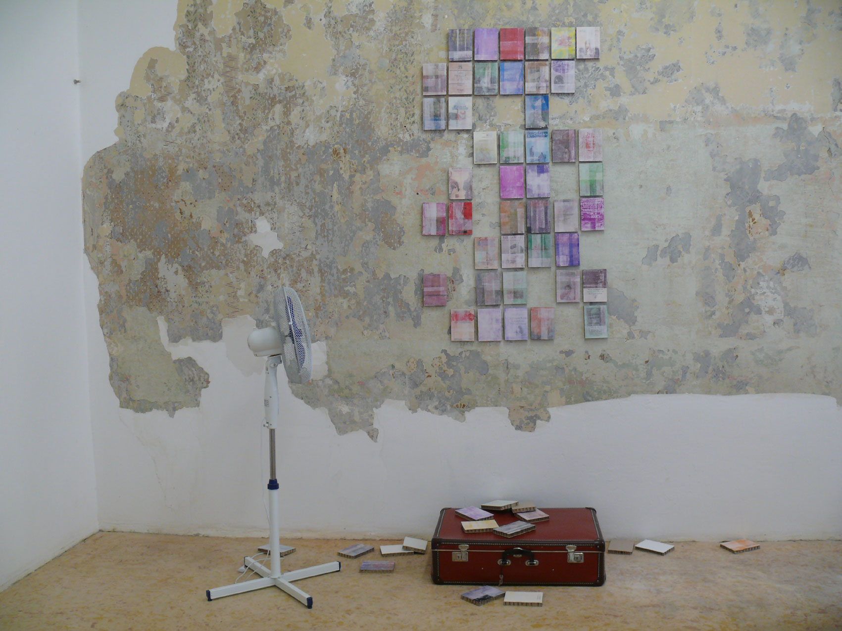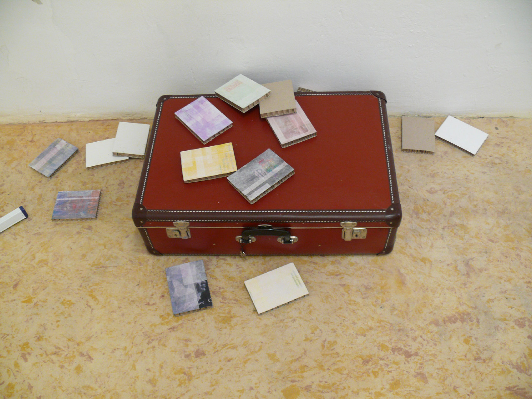 In PRIVAT VIEWING 07 antwortet Kleinlercher auf Leitners Zeitkapsel in grosser Gelassenheit mit einer eigenen Zeitkapsel. Praktischerweise ist das ein antiker Reisekoffer aus Kunstleder mit niedlichem Papierfutter im Inneren, in dem vom Künstler über Jahrzehnte sogenannte Bücher aufbewahrt wurden. 63 an der Zahl. Dieser Koffer ruht nun im Zeitalter der romantischen Selbstüberbelichtung, in dem die verlorenen Seelen in ihrer eigenen virtuellen Galerien eingesperrt sind, geduldig am Boden. Kleinlercher hat über den Koffer 63 Kopien von enthaltenen Titeln so elegant in einer strengen Reihung an der Wand arrangiert, dass man beinahe übersieht, wie er unsere Wahrnehmung hier manipuliert.
