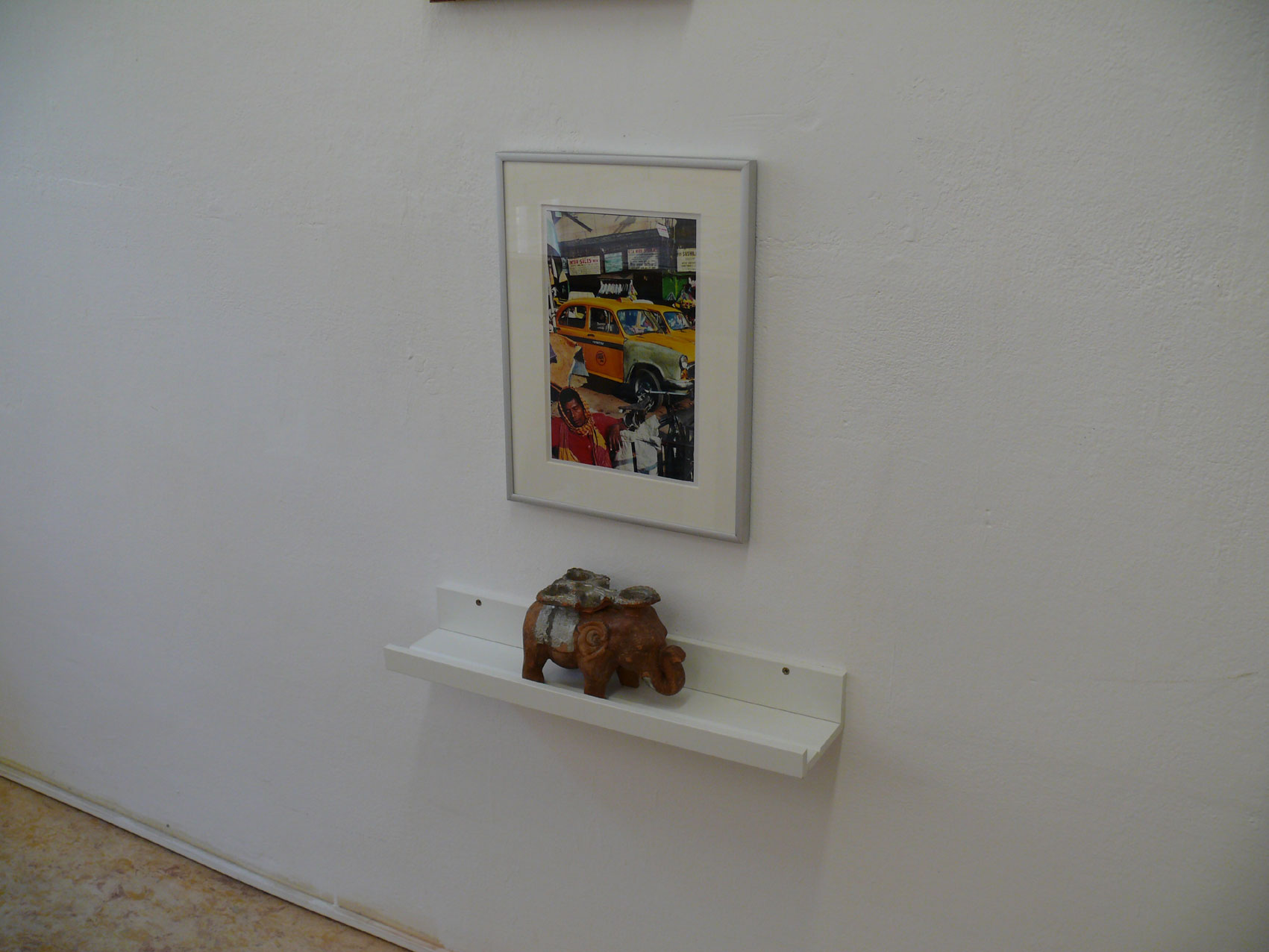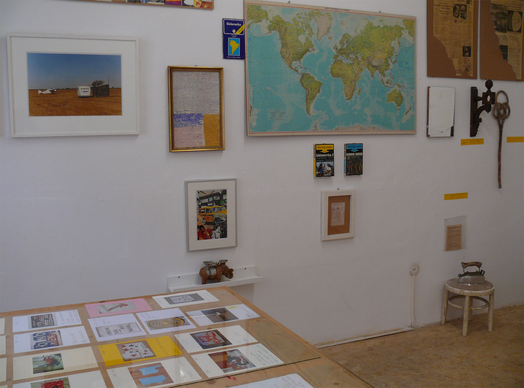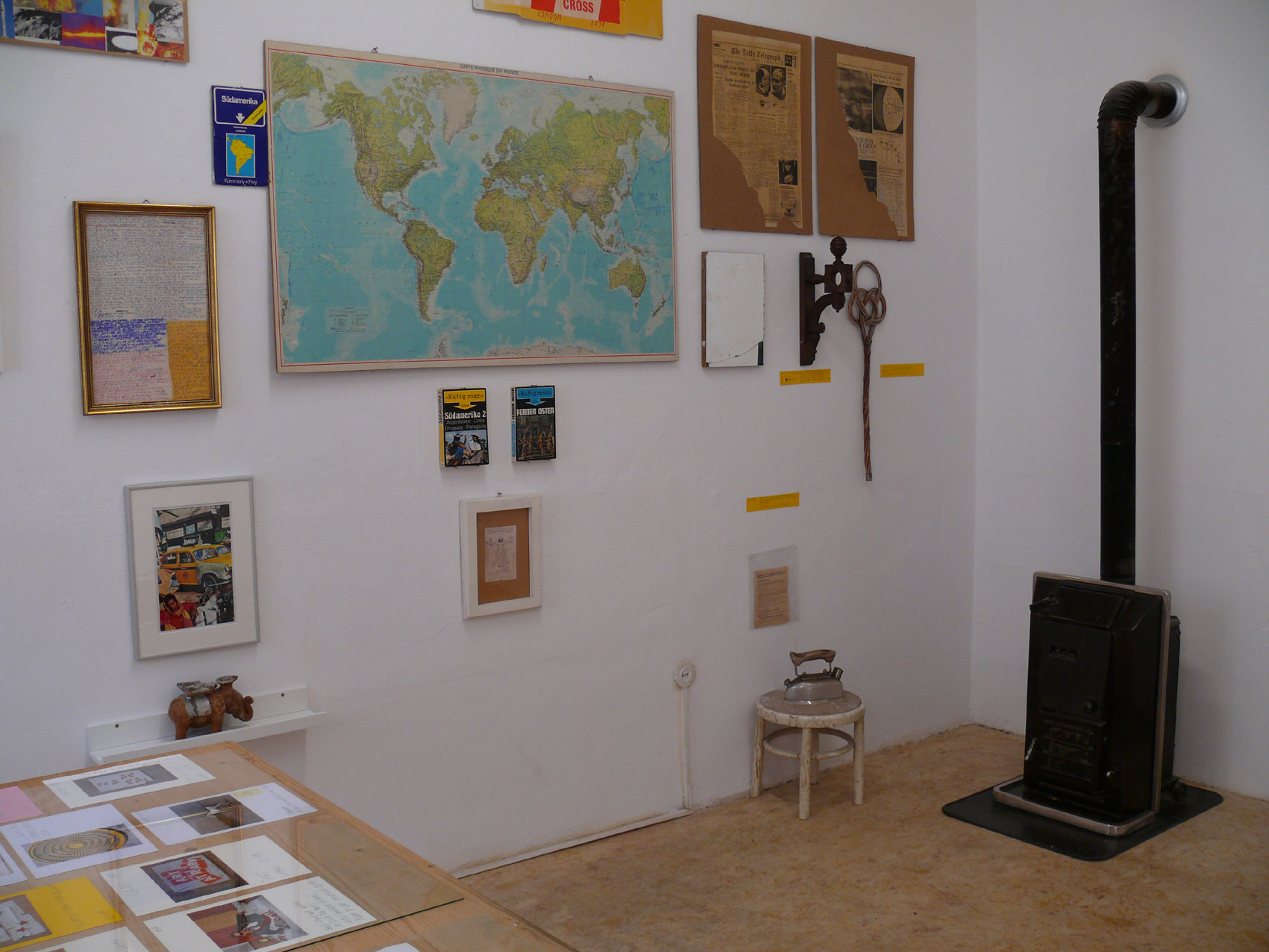Die Installation besteht aus 25 Exponaten. Links oben die Collage Blue Moon (2016), zentral eine Weltkarte, die schon in Leitners Jugendzimmer baumelte, rechts oben Zeitungsseiten des Daily Telegraph mit Berichten über die Mondlandung 1969, dann noch weitere Karten, ein Verbotsschild aus London (»Do not cross«), ein Südamerika-Guide (1980) sowie diverse Fund- und Erinnerungstrophäen: ein Teppichklopfer, ein Spiegel, die Halterung einer Vorhangstange, das Express-Dampfstrahlgerät der Grossmutter mit der originalen Gebrauchsanweisung. Das Bügeleisen kostete 1954 umgerechnet 18 Euro, auf der Bügelsohle sind gut die drei Dampfaugen zu erkennen. Wir sehen von Leitners handwerklich geschicktem Vater gefertigte Rindertrophäen, einen Regenschirmständer, einen Souvenir-Elefanten aus Kalkutta, von wo der Künstler ein weiteres Mal als unbeugsamer Atheist heimgekehrt ist.