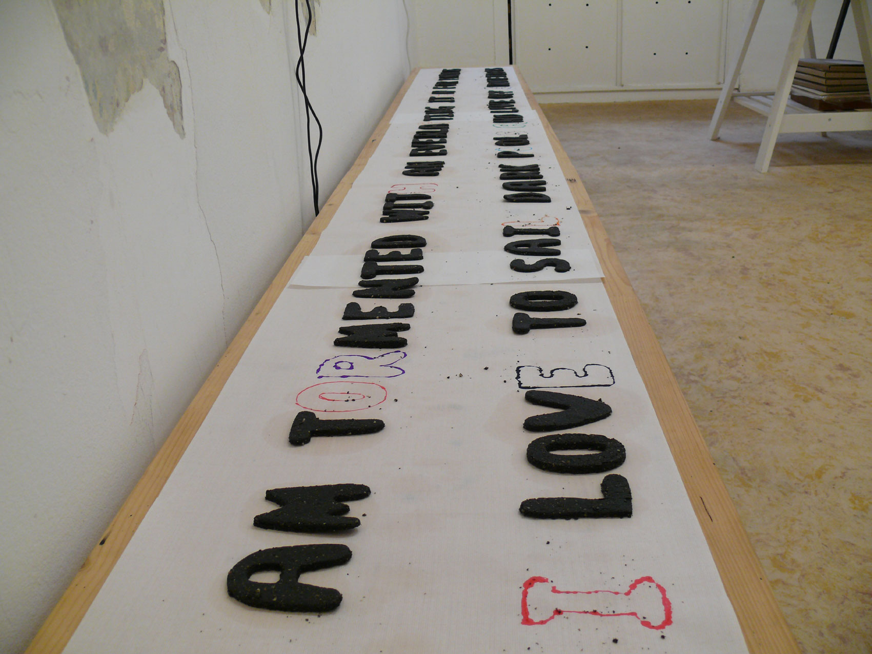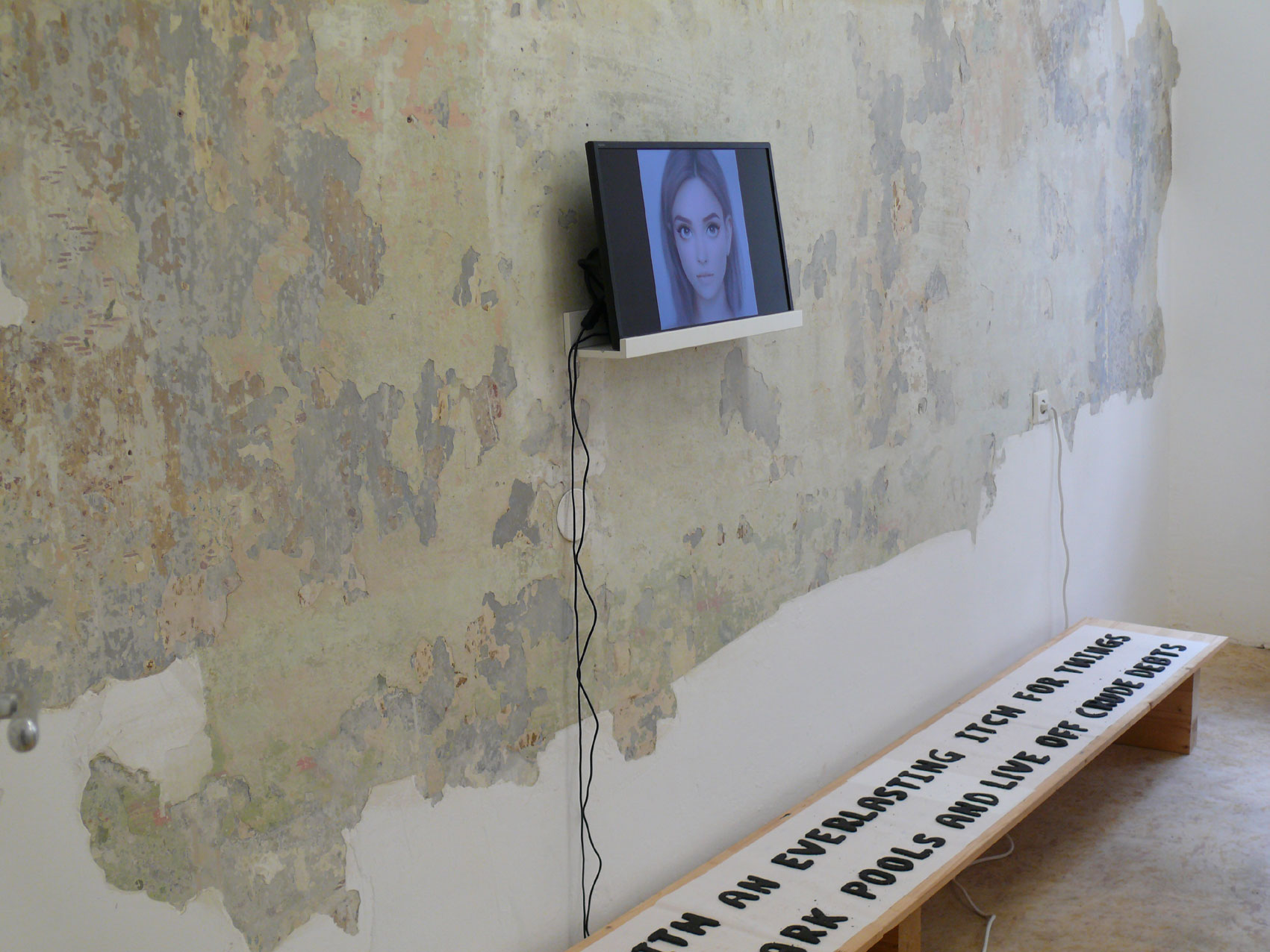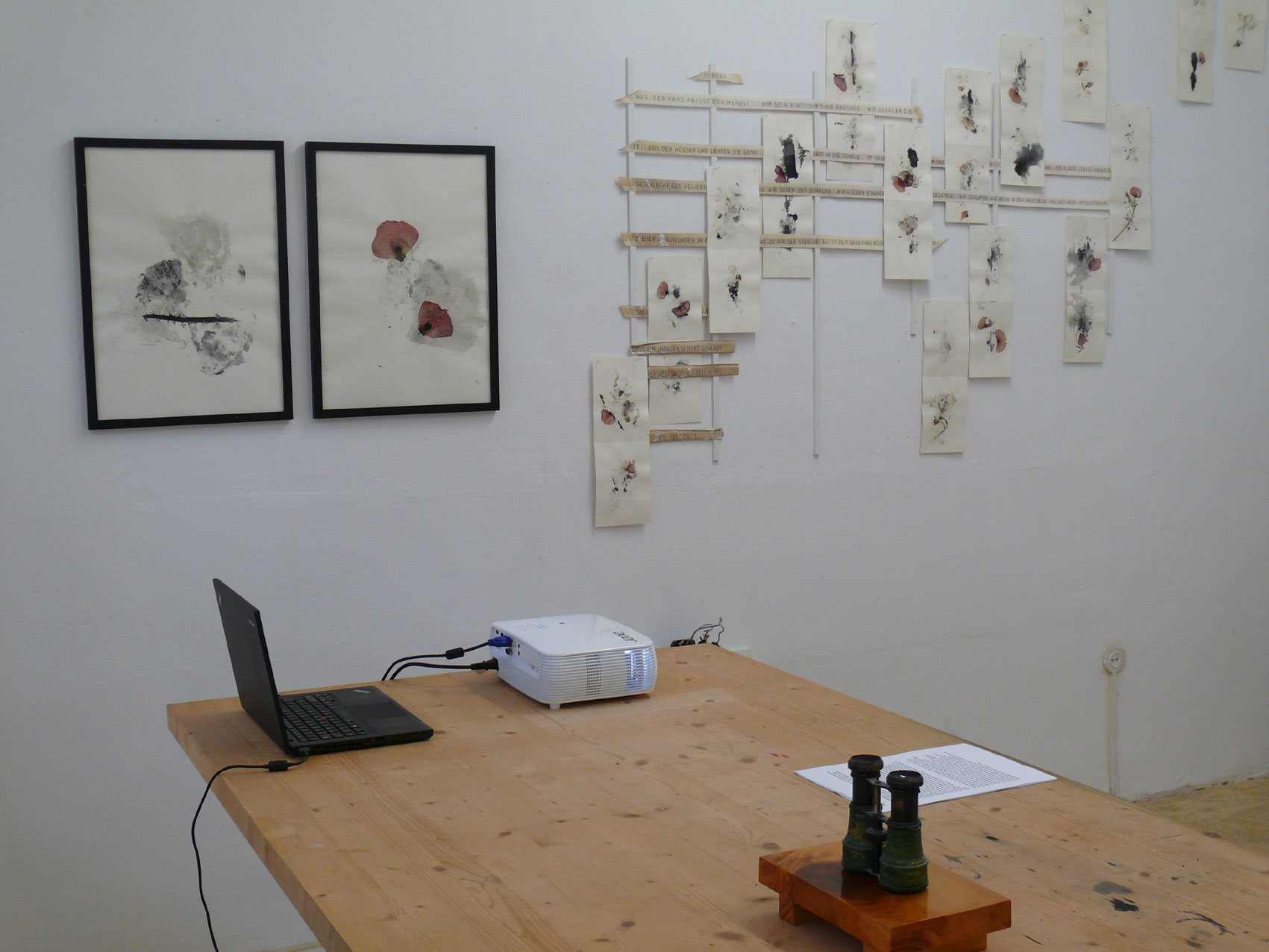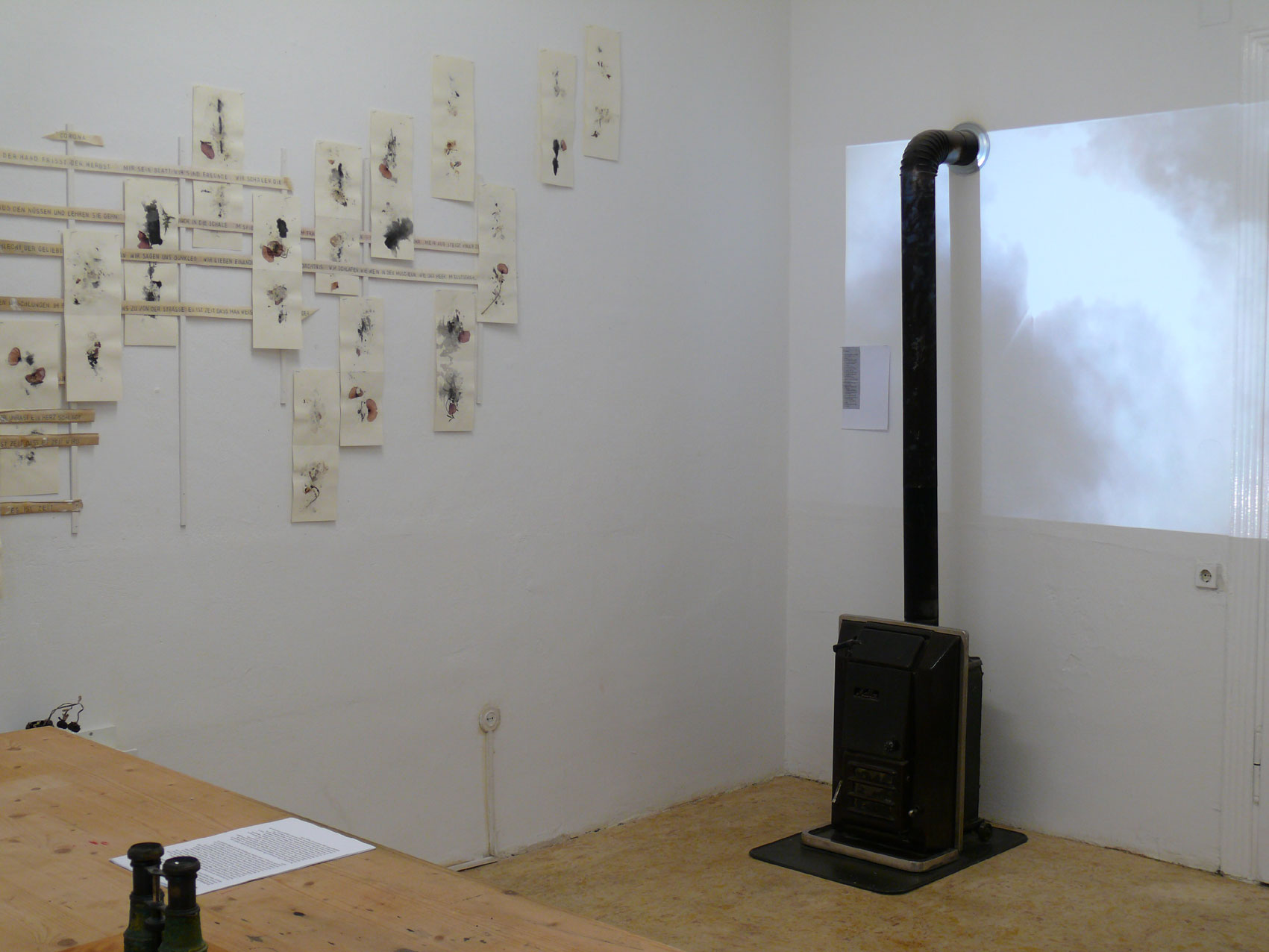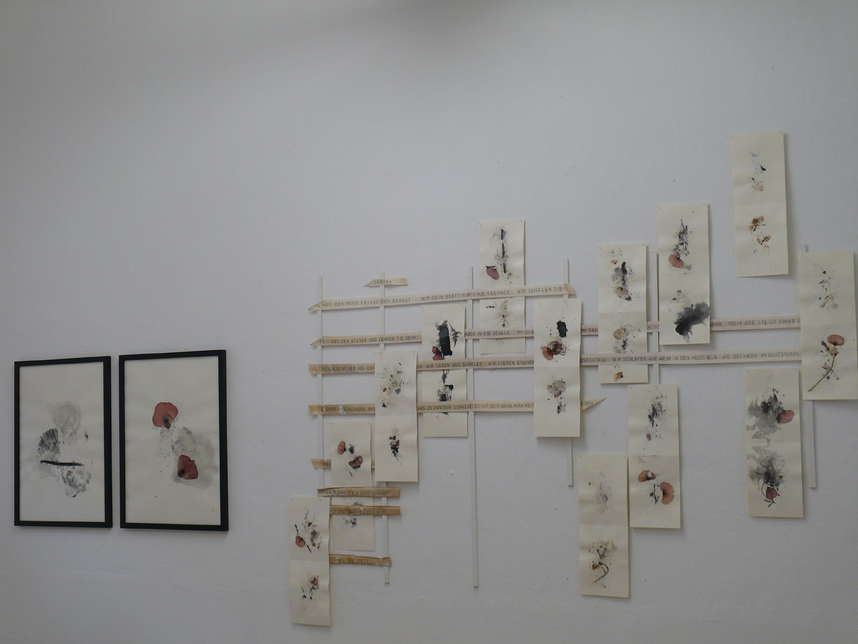Die auf gebrauchte Leinwandstreifen aufgestempelten Buchstaben tragen eine Leichtigkeit, die Patina der Vergänglichkeit in sich, sind unpräzise, wie hingehaucht. Nicht das gesamte Gedicht ist sichtbar ausgelegt, fehlende Satzteile machen die Brüche sichtbar, im Leben wie in der Liebe. Quasi überschrieben von kleinformatigen Blättern aus der „beyond ikebana“ Werkserie des Künstlers, Mohn-Arbeiten, entstanden während der Lockdownzeit im April dieses Jahres. In einer Weiterentwicklung, der mittlerweile über mehrere Jahre andauernden Blumenserie, hat sich Kleinlercher die alte japanische nature print Technik „Gyotaku“ angeeignet, um sie in seinen aktuellen Blumenarbeiten anzuwenden. Das zusätzliche kontrollierte Zulassen von Schimmel auf den Blättern lässt eine einzigartige Aura in der ästhetischen Wahrnehmung entstehen, etwas anzüglich Morbides, das im Zusammenhang mit dem Corona-Video, welches sich aus Aufnahmen der Sonnenfinsterniss 1999 zusammensetzt, dem gesamten Installations-Ensemble die Vergänglichkeit alles Seienden vor Augen führt.