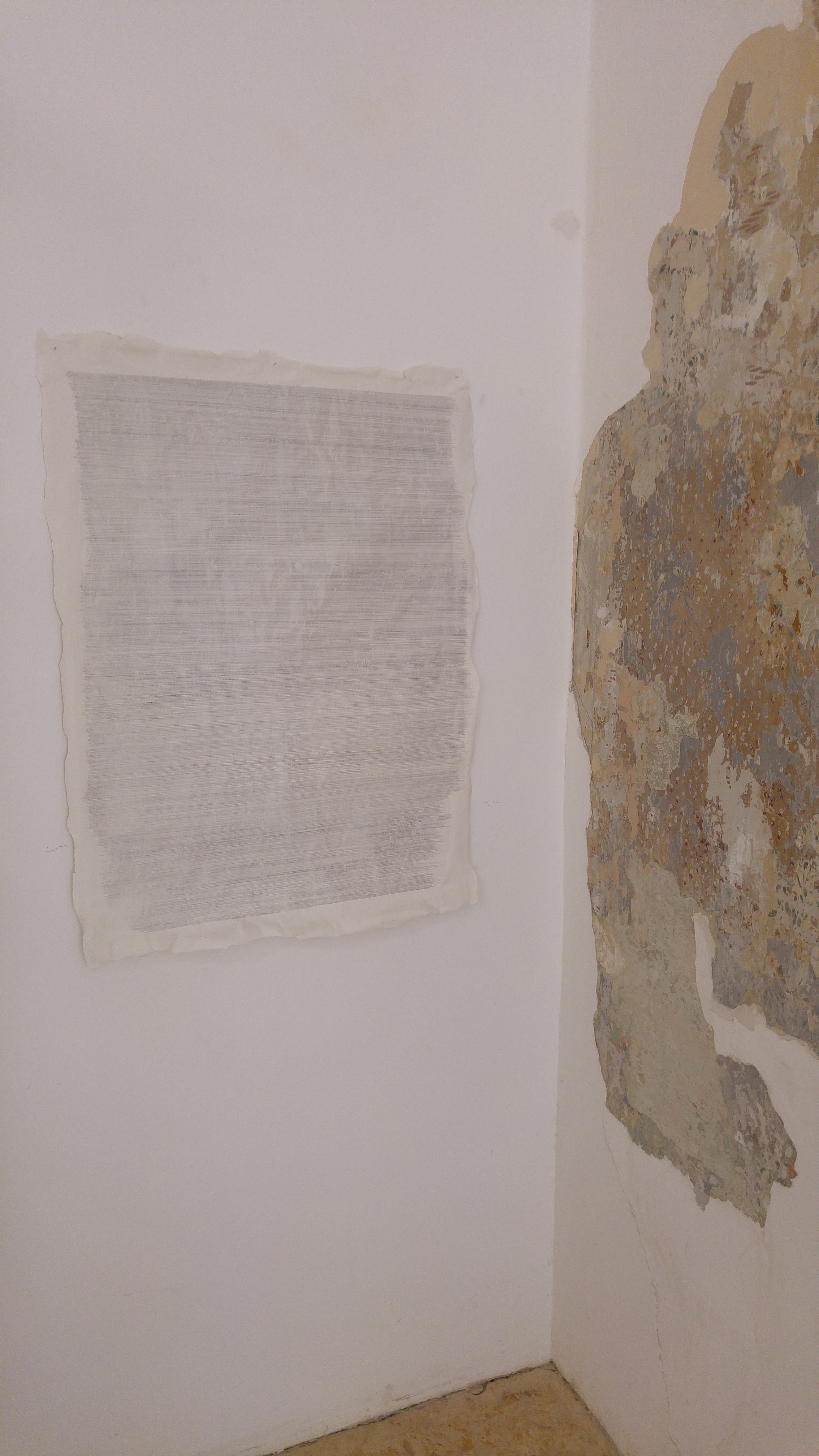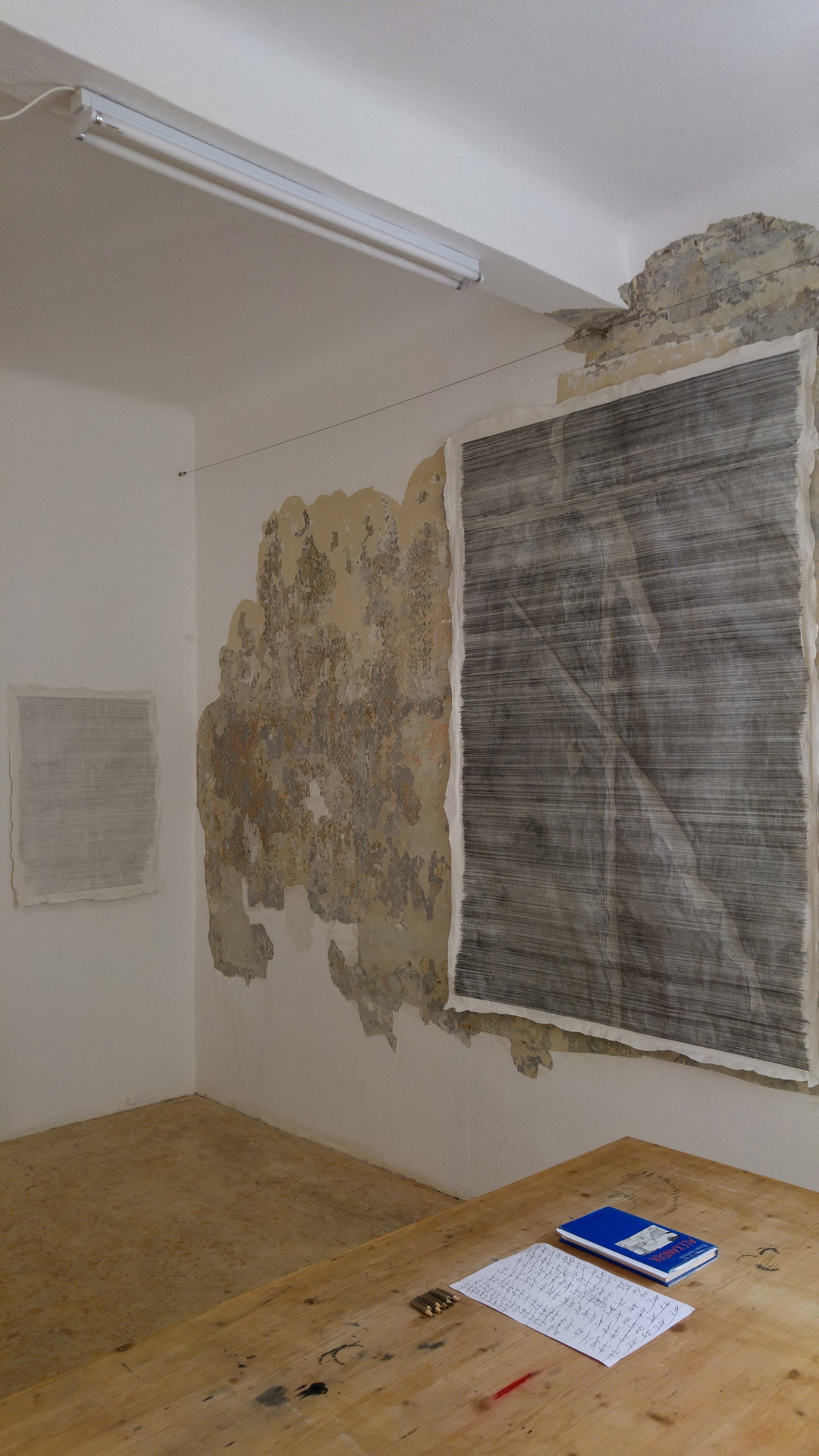 Auf der anderen, gegenüberliegenden Wand ein Schriftbild ohne Schrift – waagrecht über eine große, unregelmäßig ausufernde Papierseite gezogene Bleistiftlinien, die zwar gerade, nämlich mit Hilfe einer Wasserwaage, gezogen sind, aber unterschiedliche Strichstärken, Hell-Dunkel-Modulationen und Abstände zueinander aufweisen. Etwas hat sich hier in aller Gleichförmigkeit zusammengeschoben und verdichtet; unter der Hand, die den Bleistift tausende Male von einem zum anderen Rand des Papiers geführt hat, ist eine Landkarte entstanden, die zugleich die Landschaft ist. In diese eingesickert oder aus ihr herausgetreten sind mäandernde Flüsse, graue und lichtere Wolkenformationen, unterschwellig sich abzeichnende Marianen-Gräben. Auf deren Grund liegt ein Buch, dessen sämtliche Seiten hier auf einmal aufgeschlagen sind und dessen Text/Schrift in eine andere Dimension überführt worden ist.