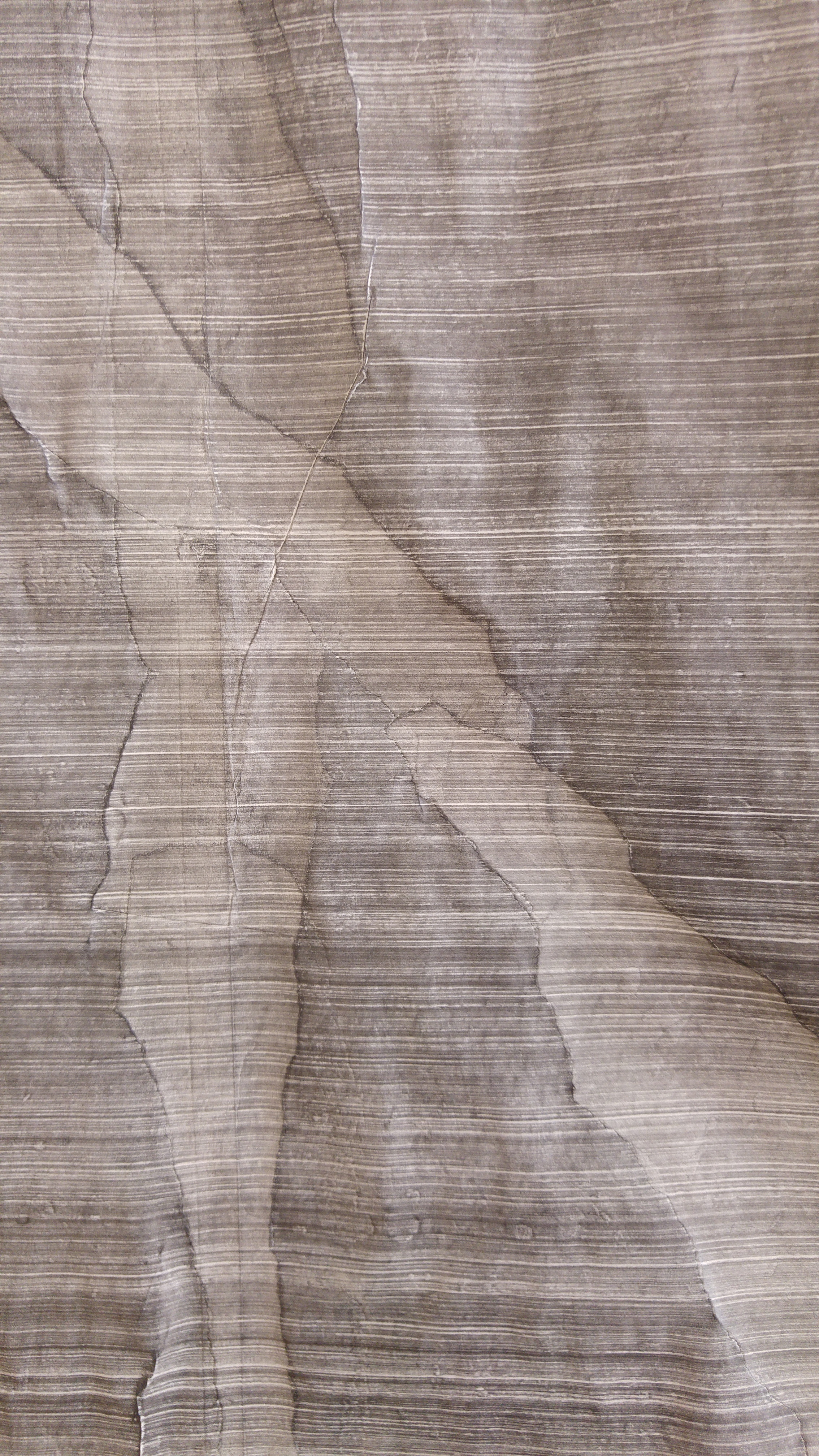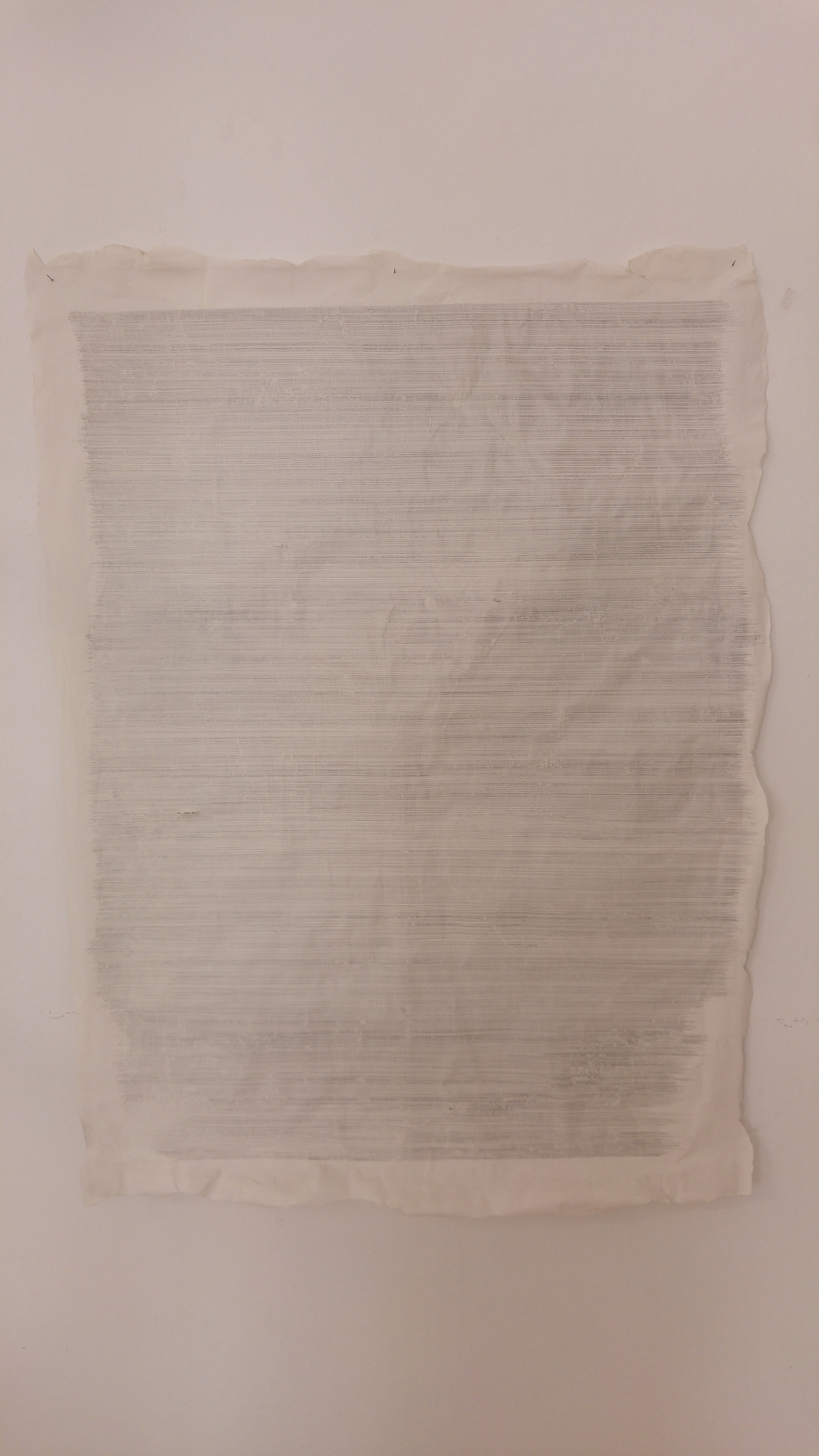 „Der Bleistift zählt die Zeilen / eurer Lieder“, hat Ernst Herbeck einmal geschrieben (Der Hase!!!!, 128), gerade so, als hätte der Autor schon vor 50 Jahren dieses Schriftbild vor sich gesehen und mit einem seiner lakonischen Kommentare bedacht. Herbecks 1971 im Residenz Verlag erschienenen Gedichtband Alexander hat Toni Kleinlercher zum Ausgang seiner literarischen Frottage genommen. Mit jedem gezogenen Bleistiftstrich zählt er (zwar nicht die Zeilen), doch jedes einzelne Wort und Satzzeichen, das im Gedichtband abgedruckt ist. Somit ist alles, was dort der Fall ist – jedes Wort, jeder Punkt, Beistrich, Gedankenstrich des Buchs – auf der großen grauen Landkarte verzeichnet, und hat jeweils eine horizontale Spur / einen materiellen Abrieb auf dem Papier hinterlassen. Auch letzteres Trägermaterial hat eine Geschichte beziehungsweise einige Umschichtungen erfahren. Es wurde aus mehreren, zuvor durch Wässerung vom Leim befreiten Bögen von Briefmarkenpapier zum vorliegenden Format zusammengeklittert. Die Verläufe der Klebspuren und der überarbeiteten Risse, die Aufdoppelungen und Wellungen des Papiers haben sich als Zufallsgegebenheiten in die exakte Strich-Zählung ebenso eingetragen, wie die darunterliegende Wand, die selbst schon einem Palimpsest gleicht und deren amorphe Strukturen das horizontale Linienfeld durchwachsen.
