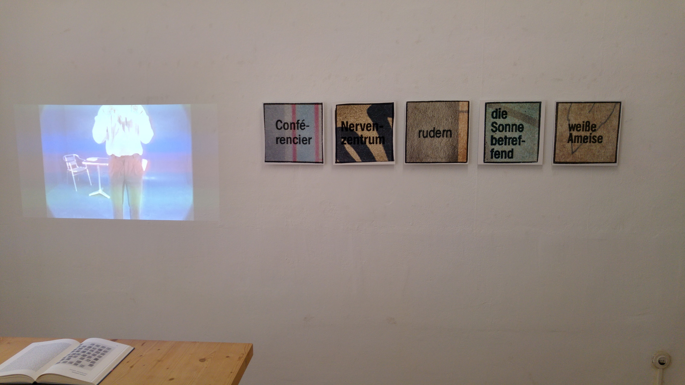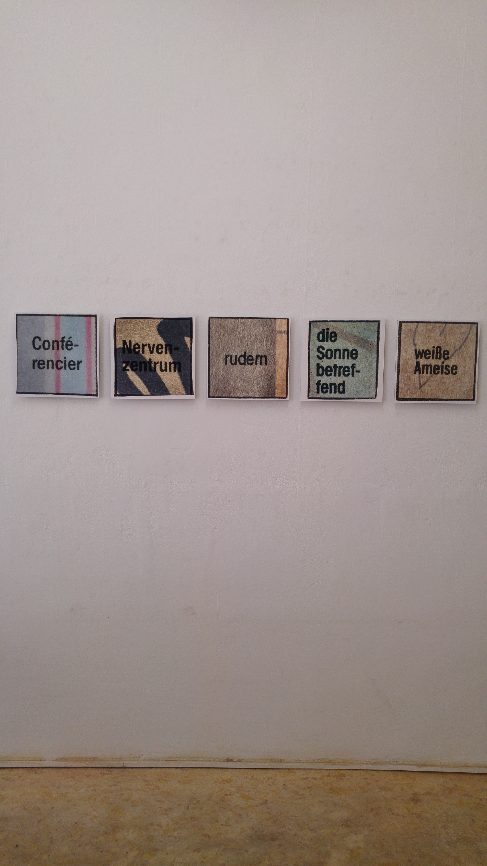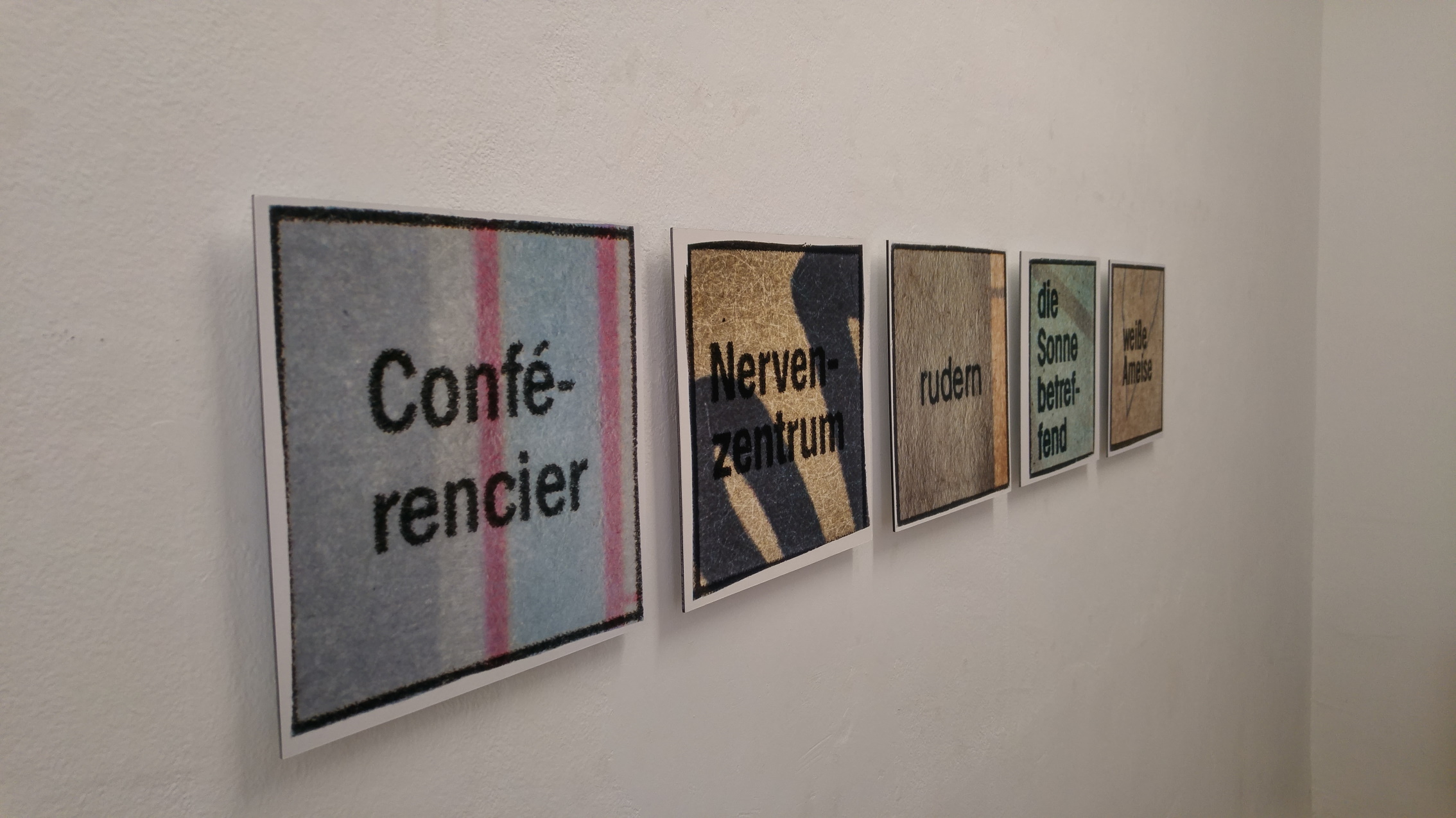 Auf der einen Wandseite Wörter, die einem sofort ins Auge springen. Ihre Gegenwart im Raum leuchtet unmittelbar ein, auch wenn sich kein zusammenhängender oder verborgener Sinn aus den 5 Schrifttafeln herauslesen lässt, die wie Bilder einer Ausstellung nebeneinander gehängt wurden. Conférencier / rudern / die Sonne betref-fend / Nerven-zentrum / weiße Ameise (in welcher Reihenfolge, das wird sich weisen / erwiesen haben). Ihr Einleuchtendes verdanken die Schriftbilder zu einem gewissen (und mit Sicherheit unbestimmten) Grad auch ihrem Herstellungsverfahren: Die zugrundeliegenden Textfundstücke wurden regelrecht durchleuchtet, sodass auch die Eintragungen auf der Rückseite des Papiers, auf dem sie ursprünglich gedruckt waren, sich wie ein Schatten abzeichnen. Das Verfahren, das Christian Steinbacher hier anwendet, zeitigt sonnenbeschienene Wörter (ein unbeabsichtigtes Surplus), deren Licht wie auf alten Agfacolor-Fotografien ein wenig zu stark und zugleich schon vergilbt scheint. Zu diesem Eindruck trägt auch das typografische Erscheinungsbild seinen Teil bei, das ein wenig aus der Zeit gefallen ist. Alles in allem leuchtende Unwägbarkeiten.