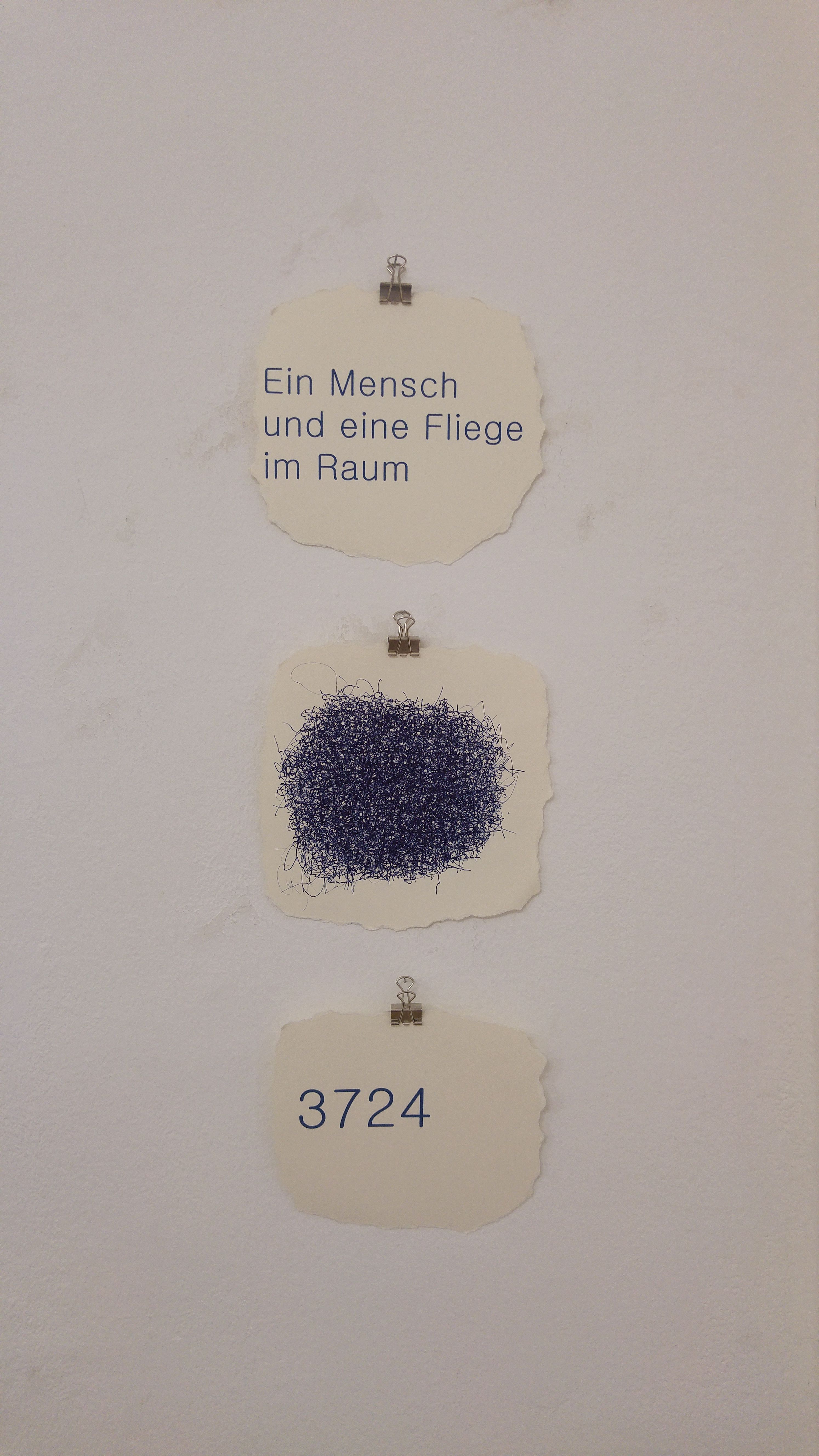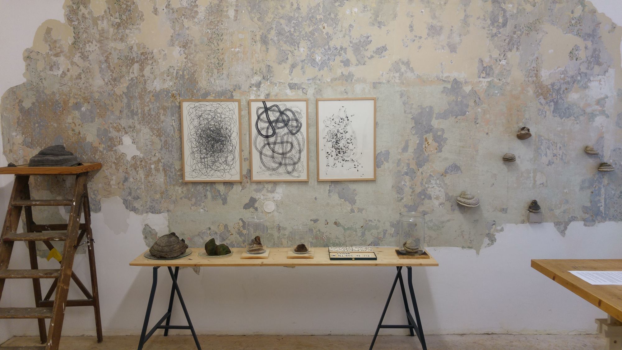 Diesem nicht definierbaren System versuche ich mich durch die zu den Schwämmen gehängten Zeichnungen anzunähern und damit zu einer gewissen Sichtbarkeit zu verhelfen.