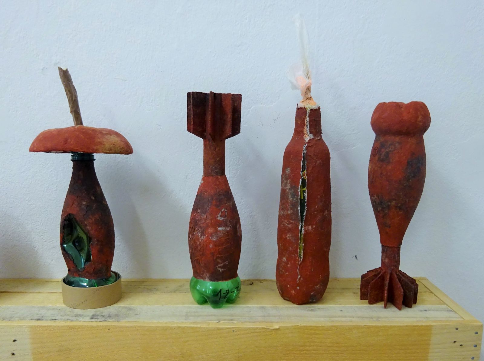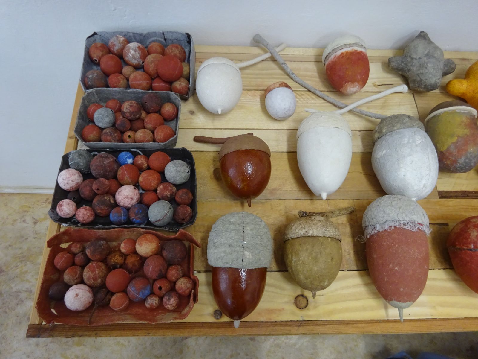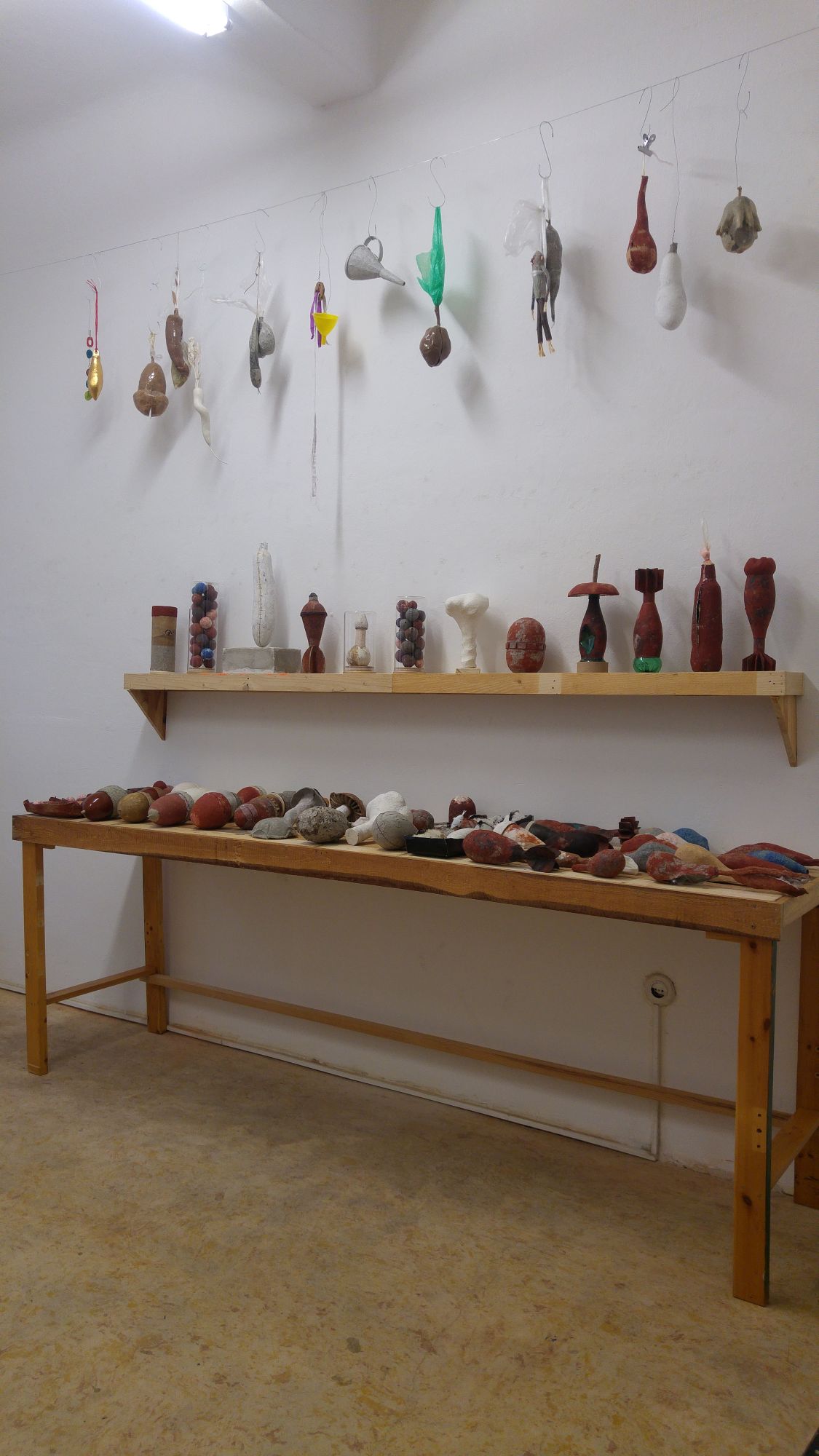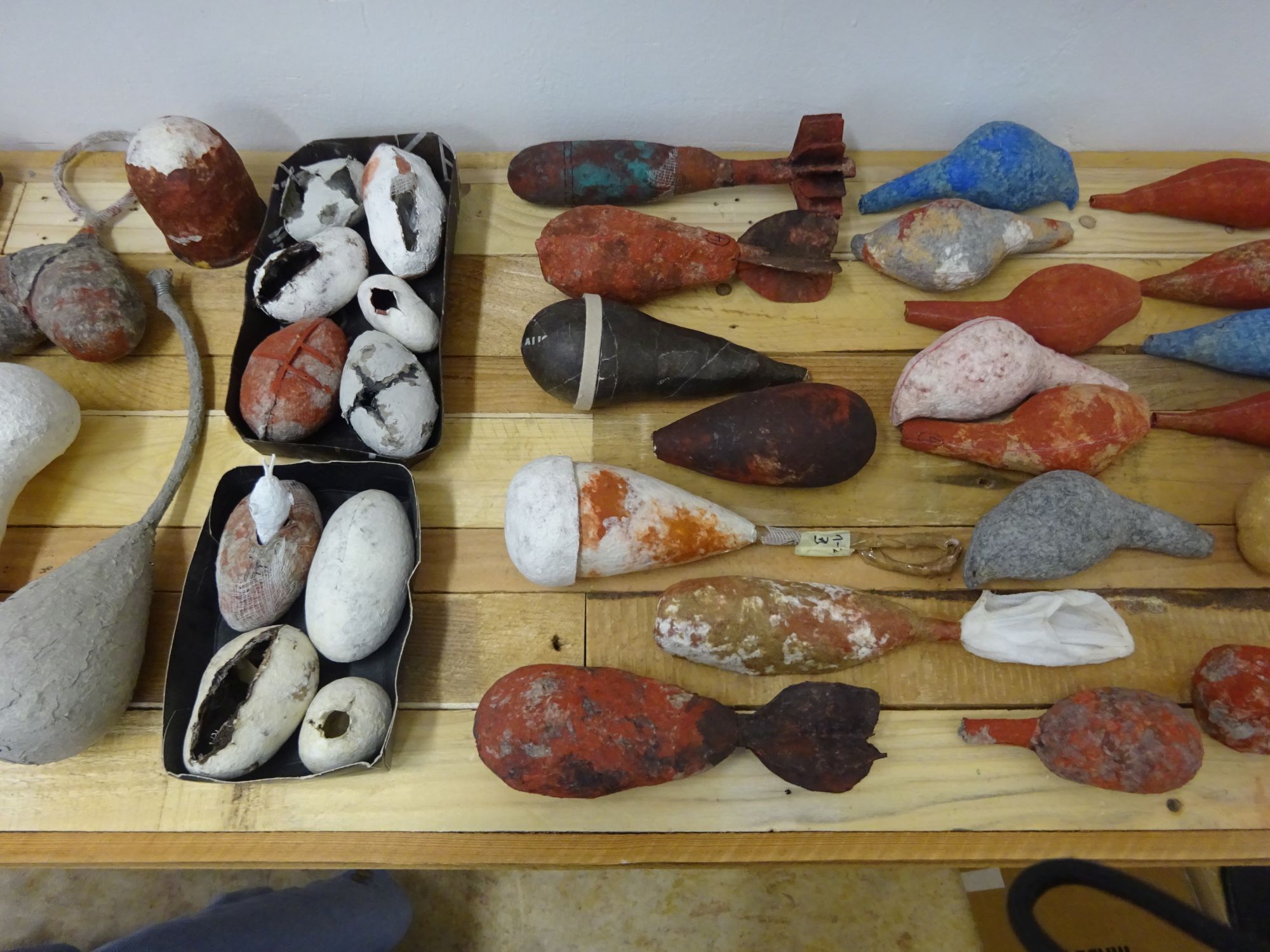 Eric berichtetet mir von Gemüse, das seinen künstlerischen Weg begleitet habe. Insbesondere Gurken, Zucchini und Pilze. Eine Doppel-Rübe, die getrennt werden musste, wurde zum Sinnbild einer anderen privaten Trennung. Nichts ist so wie es vordergründig scheint. Pilze werden zu Raketen, sind vorprogrammierte Blindgänger, eine Dauerproduktion von Kugeln sorgt für den Inhalt von Splitterbomben. Alles mit Pappmache ummantelt, nach original französischer Geheim-Rezeptur.