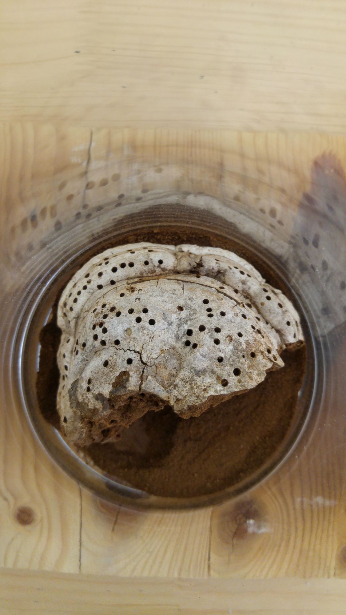 Was mich in erster Linie an den Baumschwämmen interessiert, ist das Sichtbarmachen des entropischen Vorgangs, der mittels Schwammkäfer (Ciidae) zügig vorangetrieben wird, so dass sich das Zersetzungsmaterial auf den Glastellern bzw. am Boden der Glaszylinder mehr und mehr ansammelt.