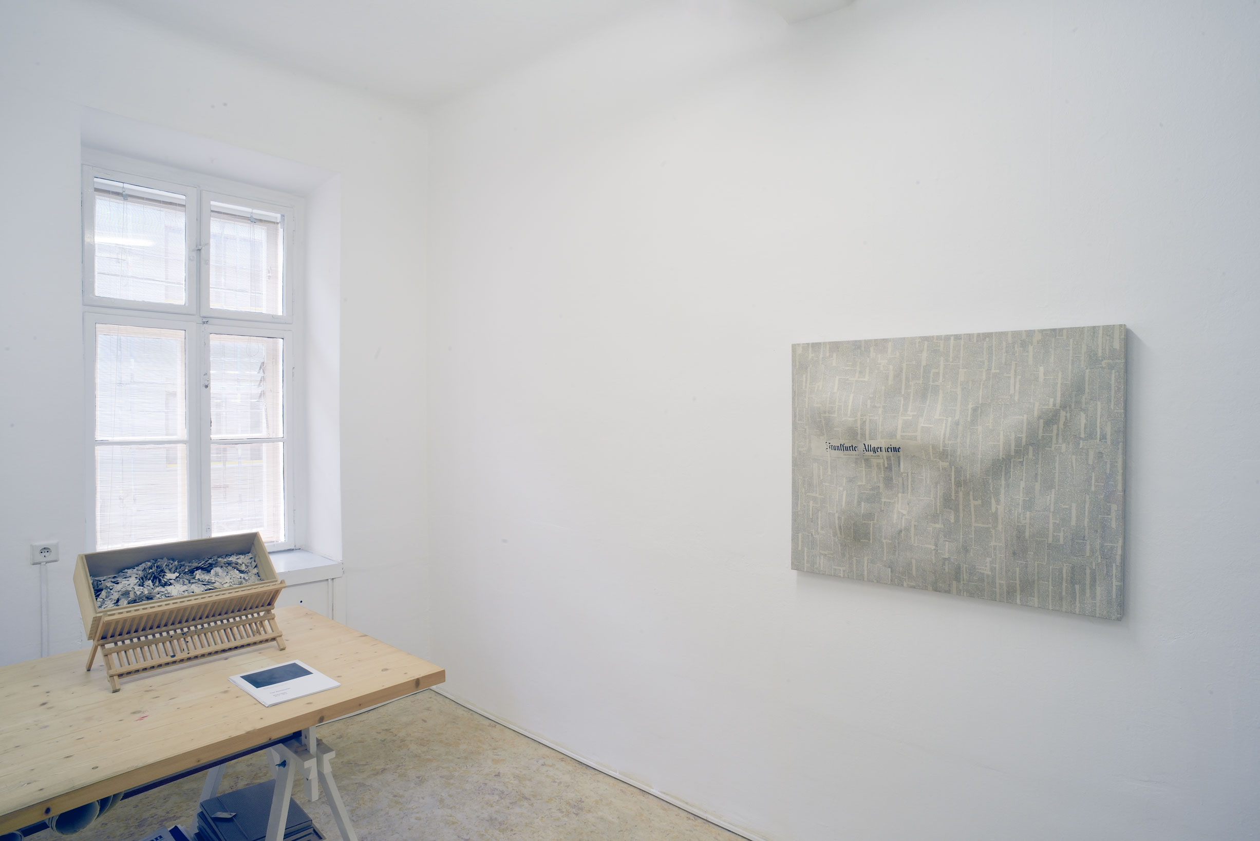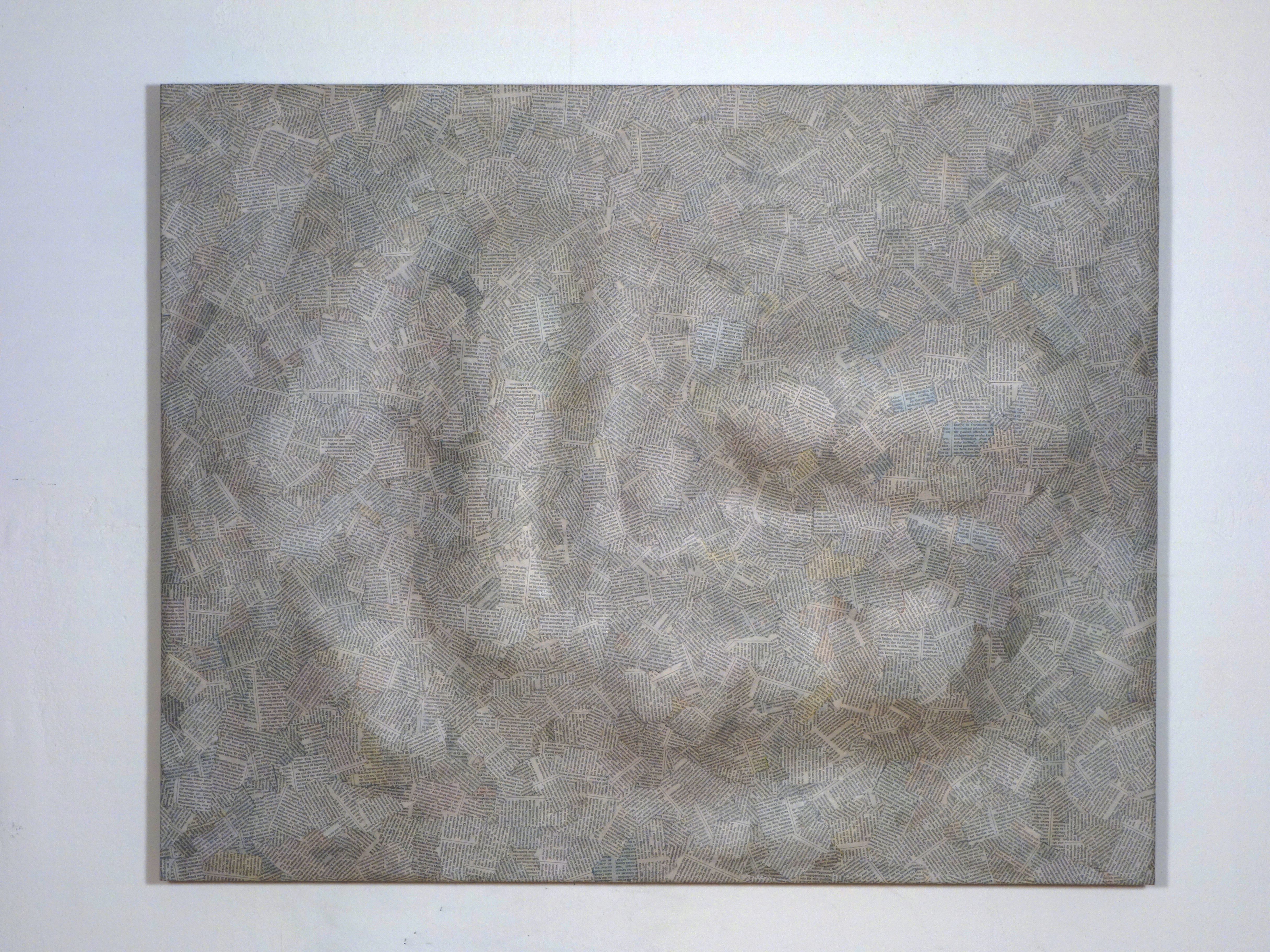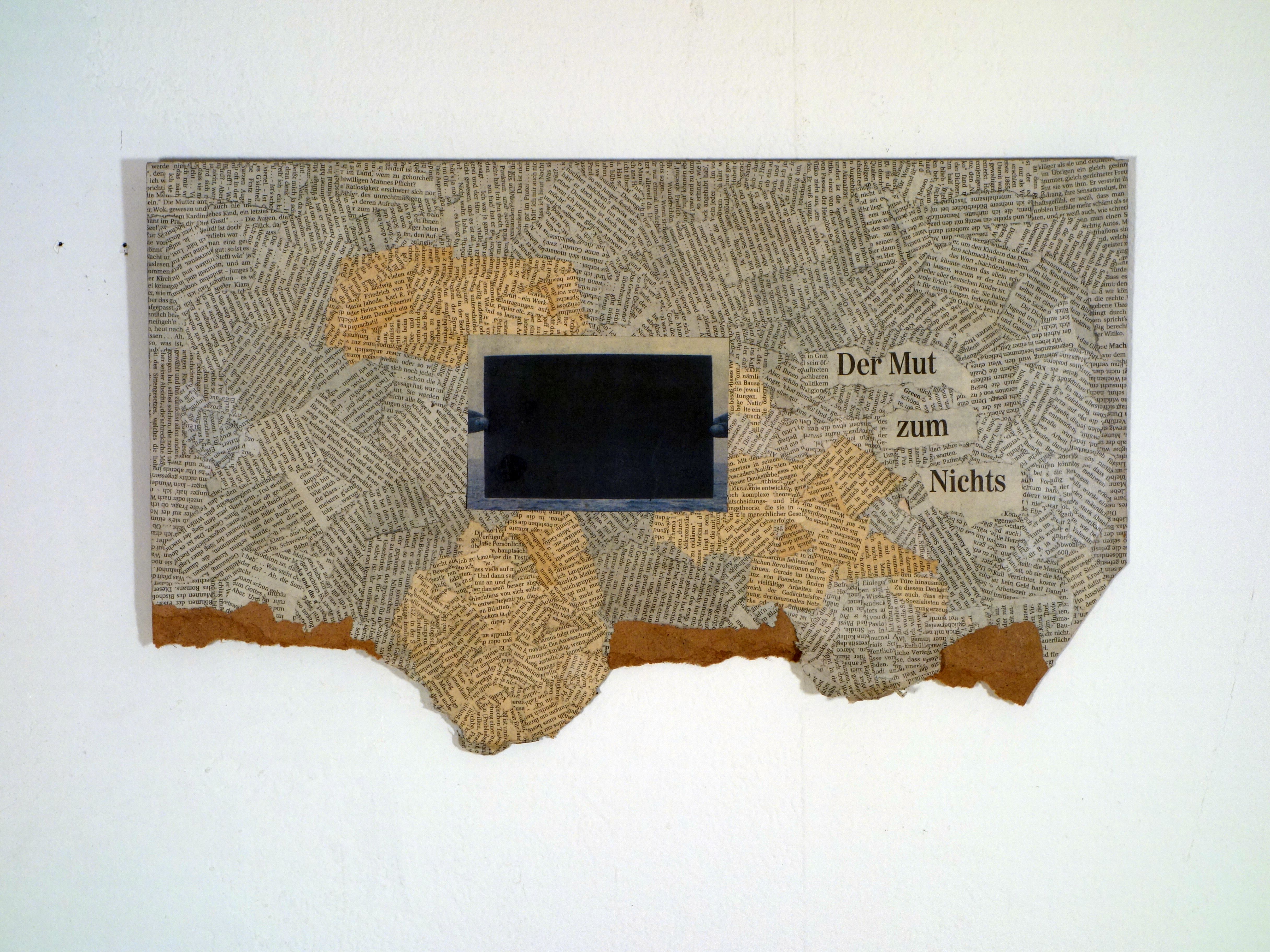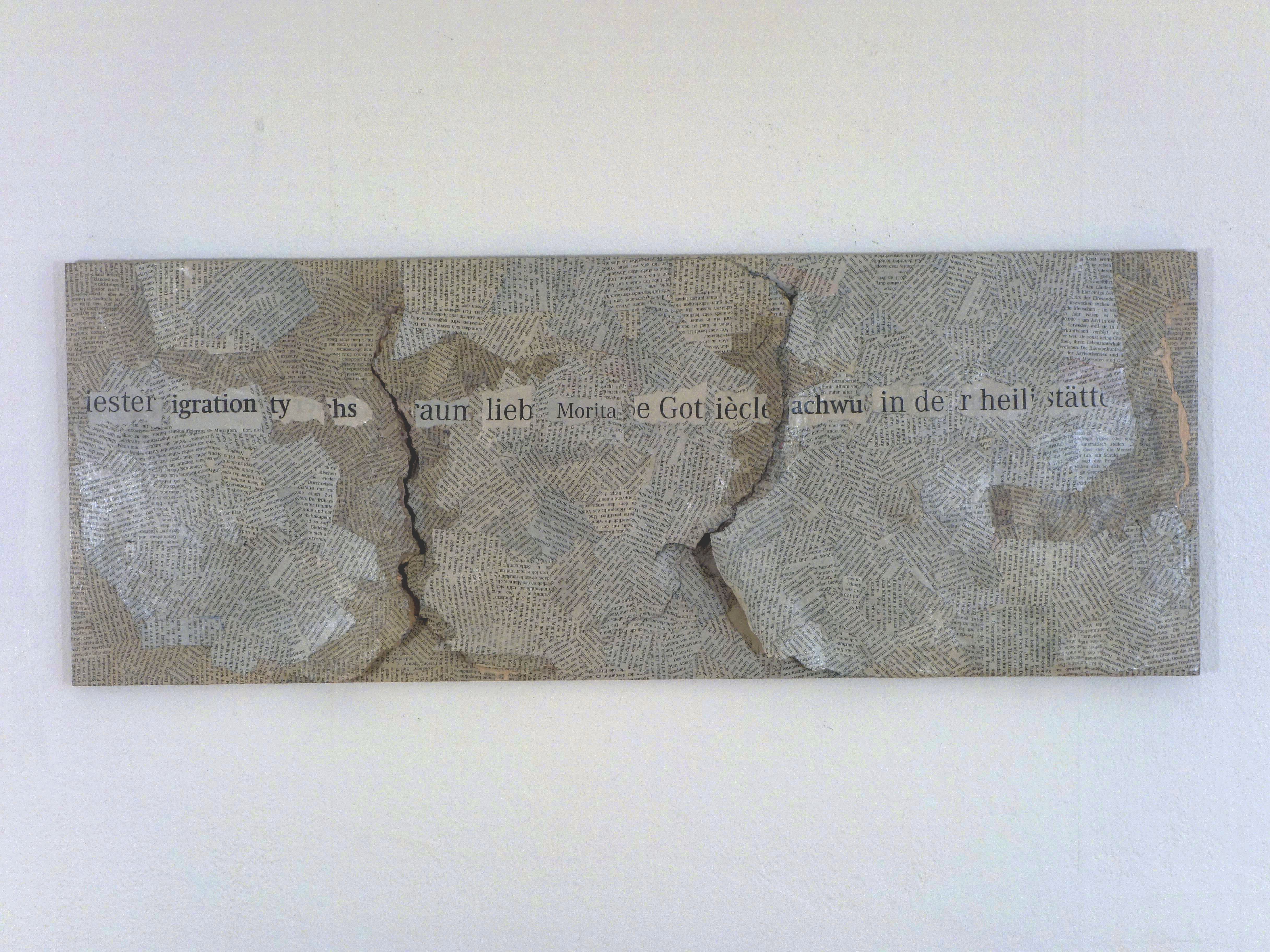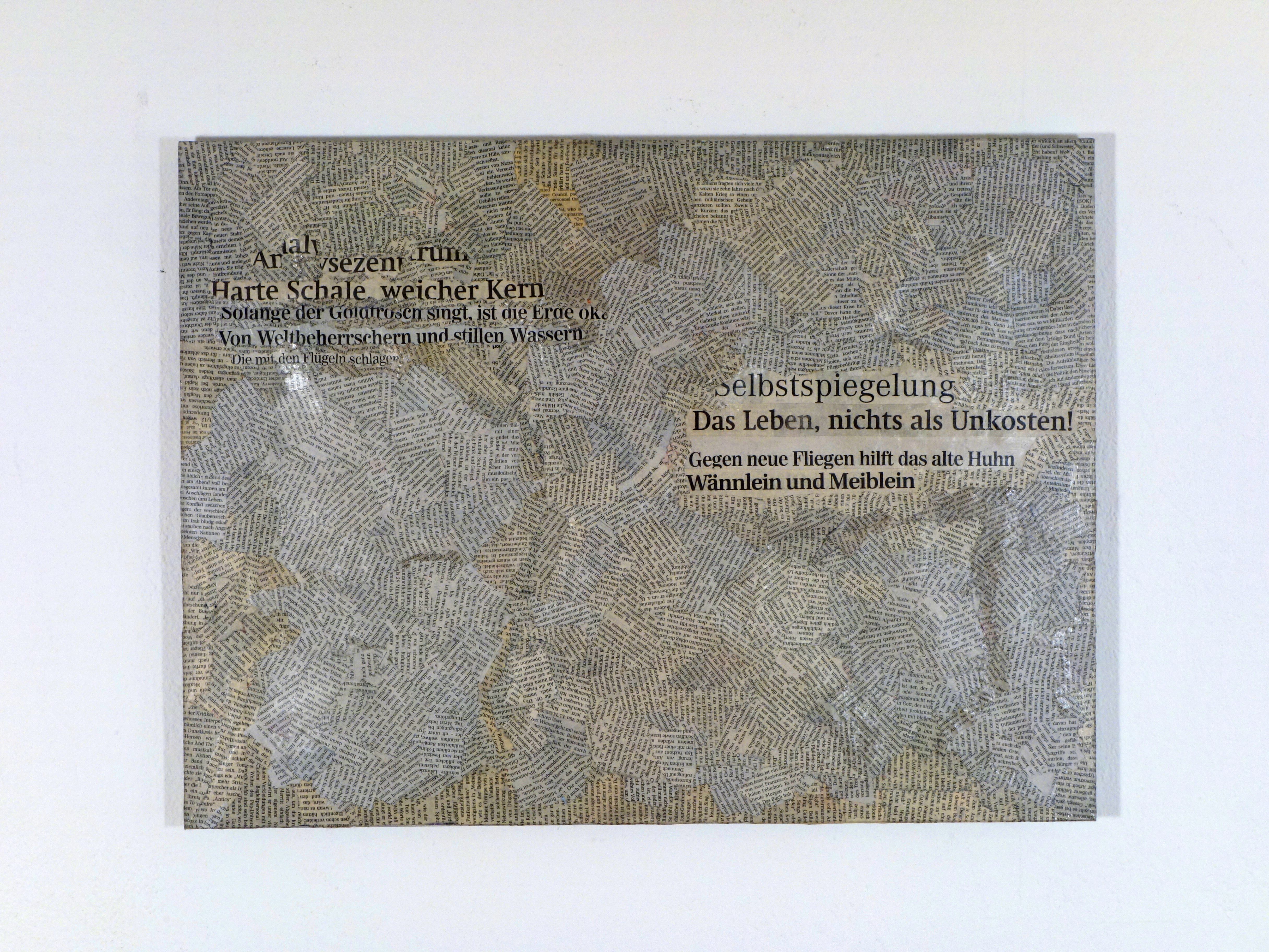 Der Inhalt einer internationalen Tageszeitung eines x-beliebigen Tages wird jeweils zur Gänze als Material collagierend in ein Relief eingearbeitet. Die Zeitungsseiten werden in Stücke gerissen, sortiert, zum einen Teil zu Pappmaché verarbeitet, zum anderen in Form von Textschnipseln wieder zu einem Ganzen zusammenfügt. Das Bildmaterial im Untergrund, wird der bloße Text an die Oberfläche platziert, ganz im Sinne einer Ars Combinatoria, einer mobilen Lesbarkeit, deren Lesbarkeit sich in der Verräumlichung, in der Metamorphose zum Relief einer Landschaft, poetisiert.